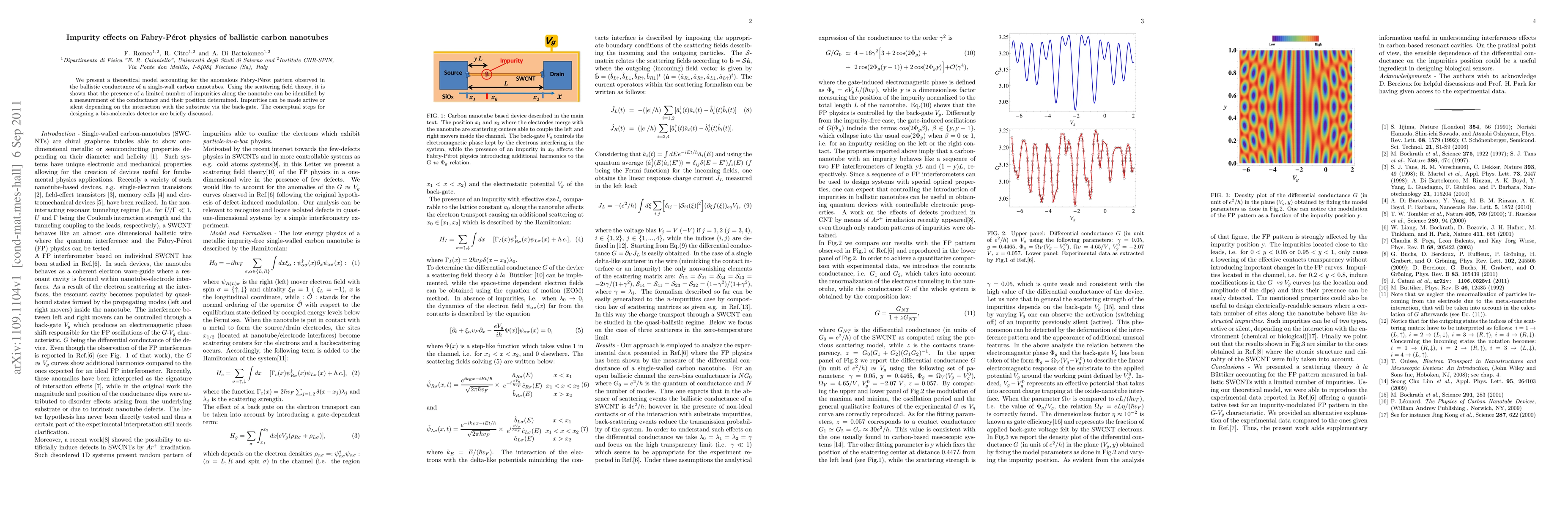 This paper presents a theoretical model explaining the anomalous Fabry-Perot pattern in the ballistic conductance of carbon nanotubes, attributing the effects to impurities. It demonstrates how impurity positions can be determined via conductance measurements and discusses potential applications in designing bio-molecule detectors.