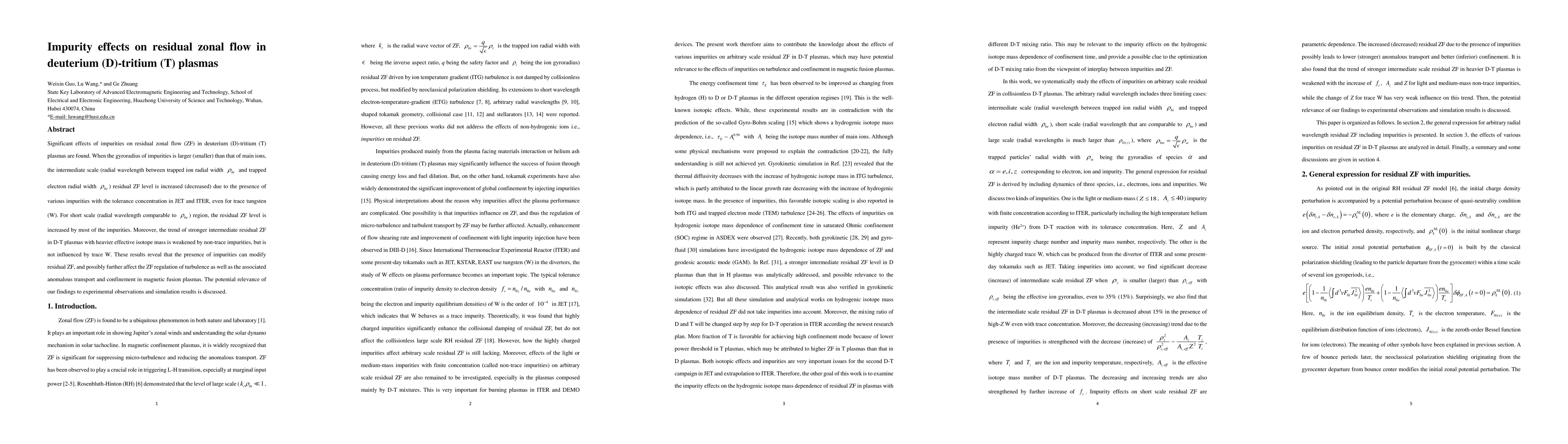 This paper investigates how impurities affect residual zonal flow (ZF) in D-T plasmas, finding that impurity gyroradius influences ZF levels, with trace tungsten having minimal impact. The presence of impurities modifies ZF, potentially affecting turbulence regulation, anomalous transport, and confinement in fusion plasmas.