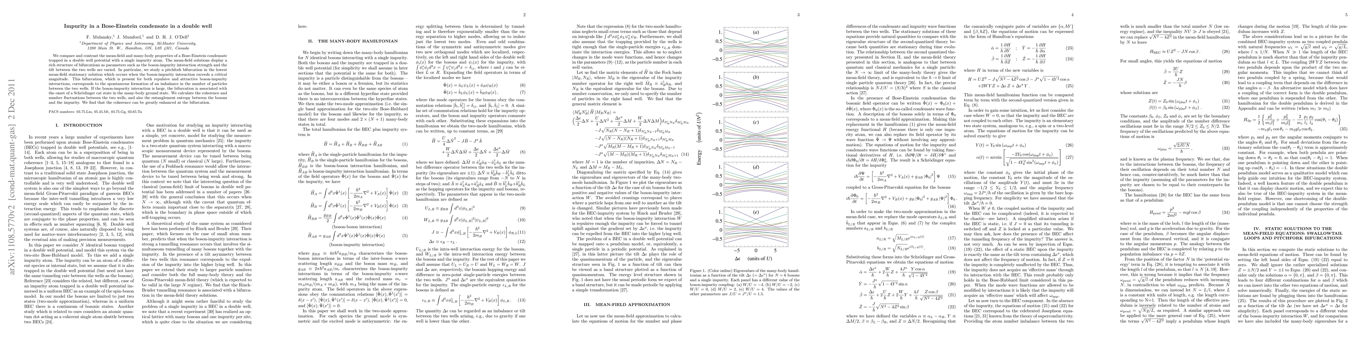 We compare and contrast the mean-field and many-body properties of a Bose-Einstein condensate trapped in a double well potential with a single impurity atom. The mean-field solutions display a rich structure of bifurcations as parameters such as the boson-impurity interaction strength and the tilt between the two wells are varied. In particular, we study a pitchfork bifurcation in the lowest mean-field stationary solution which occurs when the boson-impurity interaction exceeds a critical magnitude. This bifurcation, which is present for both repulsive and attractive boson-impurity interactions, corresponds to the spontaneous formation of an imbalance in the number of particles between the two wells. If the boson-impurity interaction is large, the bifurcation is associated with the onset of a Schroedinger cat state in the many-body ground state. We calculate the coherence and number fluctuations between the two wells, and also the entanglement entropy between the bosons and the impurity. We find that the coherence can be greatly enhanced at the bifurcation.