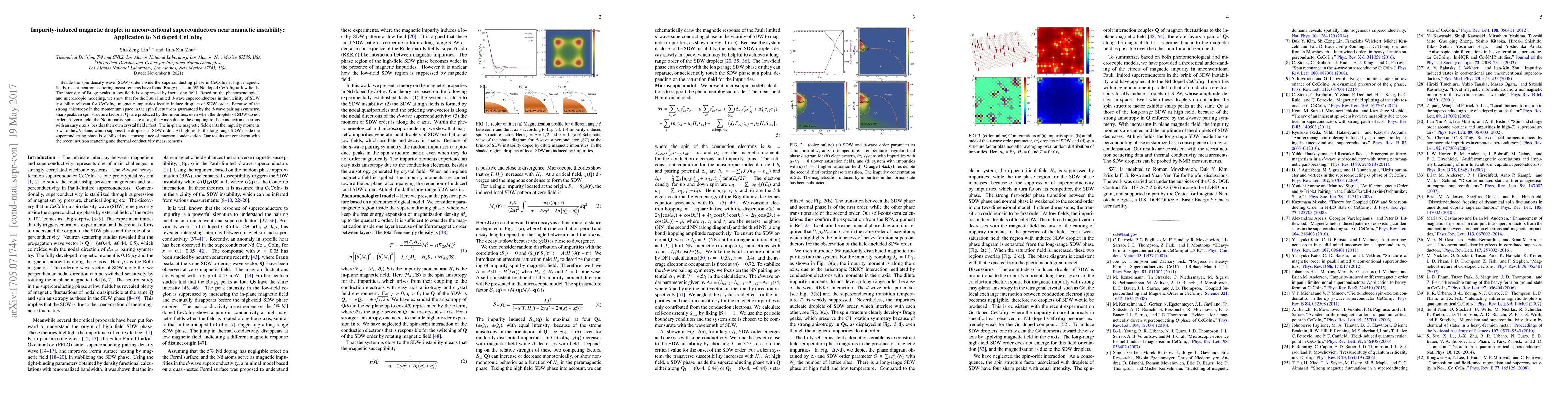 Beside the spin density wave (SDW) order inside the superconducting phase in $\mathrm{CeCoIn_5}$ at high magnetic fields, recent neutron scattering measurements have found Bragg peaks in $5\%$ Nd doped $\mathrm{CeCoIn_5}$ at low fields. The intensity of Bragg peaks in low fields is suppressed by increasing field. Based on the phenomenological and microscopic modeling, we show that for the Pauli limited $d$-wave superconductors in the vicinity of SDW instability relevant for $\mathrm{CeCoIn_5}$, magnetic impurities locally induce droplets of SDW order. Because of the strong anisotropy in the momentum space in the spin fluctuations guaranteed by the $d$-wave pairing symmetry, sharp peaks in spin structure factor at $\mathbf{Q}$s are produced by the impurities, even when the droplets of SDW do not order. At zero field, the Nd impurity spins are along the $c$ axis due to the coupling to the conduction electrons with an easy $c$ axis, besides their own crystal field effect. The in-plane magnetic field cants the impurity moments toward the $ab$ plane, which suppress the droplets of SDW order. At high fields, the long-range SDW inside the superconducting phase is stabilized as a consequence of magnon condensation. Our results are consistent with the recent neutron scattering and thermal conductivity measurements.