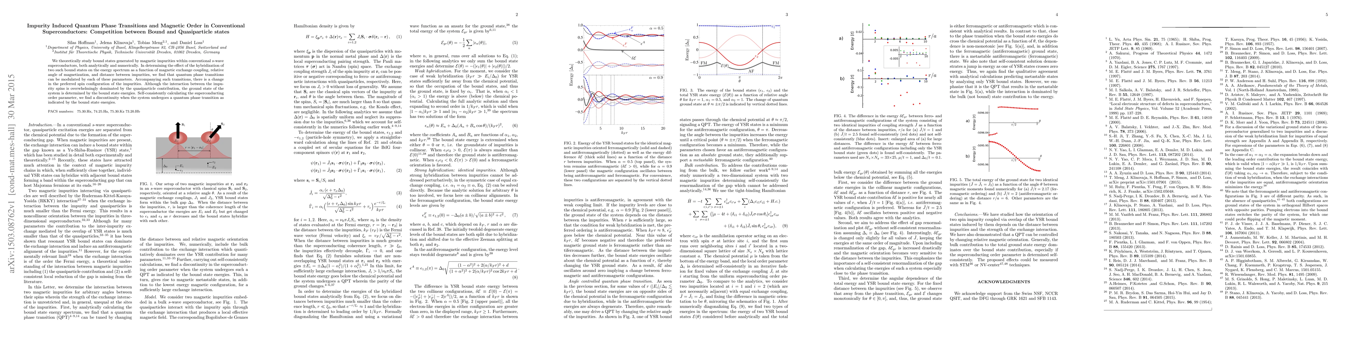 This paper investigates the impact of magnetic impurities on conventional $s$-wave superconductors, revealing that quantum phase transitions and magnetic order are influenced by the hybridization of bound states and quasiparticle interactions. The study finds a discontinuity in the superconducting order parameter during these transitions, highlighting the interplay between bound states and impurity spin configurations.