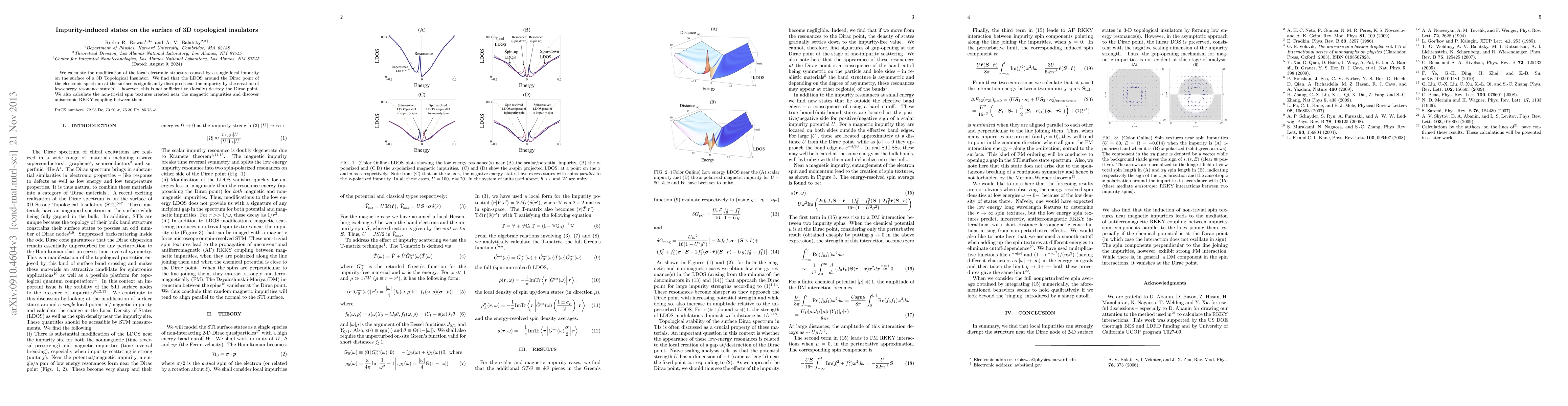 Researchers study how impurities on 3D topological insulators' surfaces affect their electronic structure, finding that a single impurity creates low-energy resonance states but doesn't destroy the Dirac point.