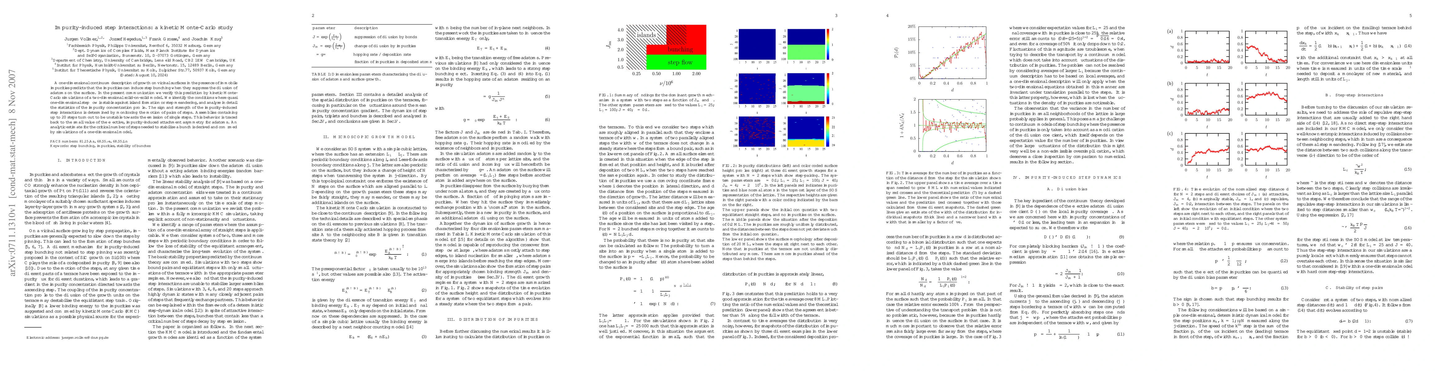A one-dimensional continuum description of growth on vicinal surfaces in the presence of immobile impurities predicts that the impurities can induce step bunching when they suppress the diffusion of adatoms on the surface. In the present communication we verify this prediction by kinetic Monte-Carlo simulations of a two-dimensional solid-on-solid model. We identify the conditions where quasi one-dimensional step flow is stable against island formation or step meandering, and analyse in detail the statistics of the impurity concentration profile. The sign and strength of the impurity-induced step interactions is determined by monitoring the motion of pairs of steps. Assemblies containing up to 20 steps turn out to be unstable towards the emission of single steps. This behavior is traced back to the small value of the effective, impurity-induced attachment asymmetry for adatoms. An analytic estimate for the critical number of steps needed to stabilize a bunch is derived and confirmed by simulations of a one-dimensional model.