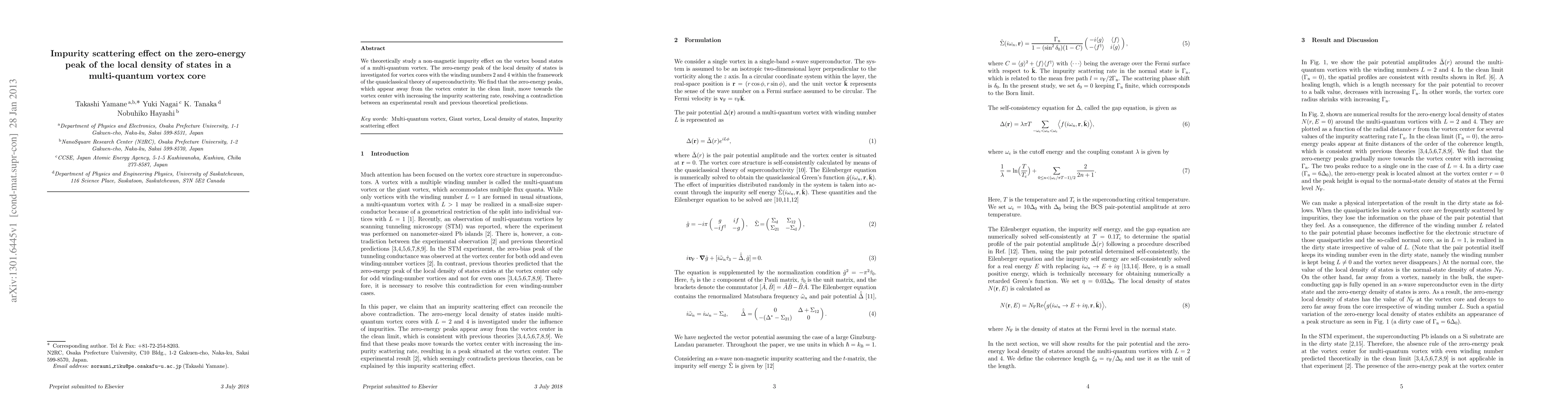 This paper investigates how non-magnetic impurity scattering affects the zero-energy peak in the local density of states of multi-quantum vortex cores, showing that impurity scattering shifts the peak towards the vortex center, resolving discrepancies between experimental findings and prior theoretical predictions.