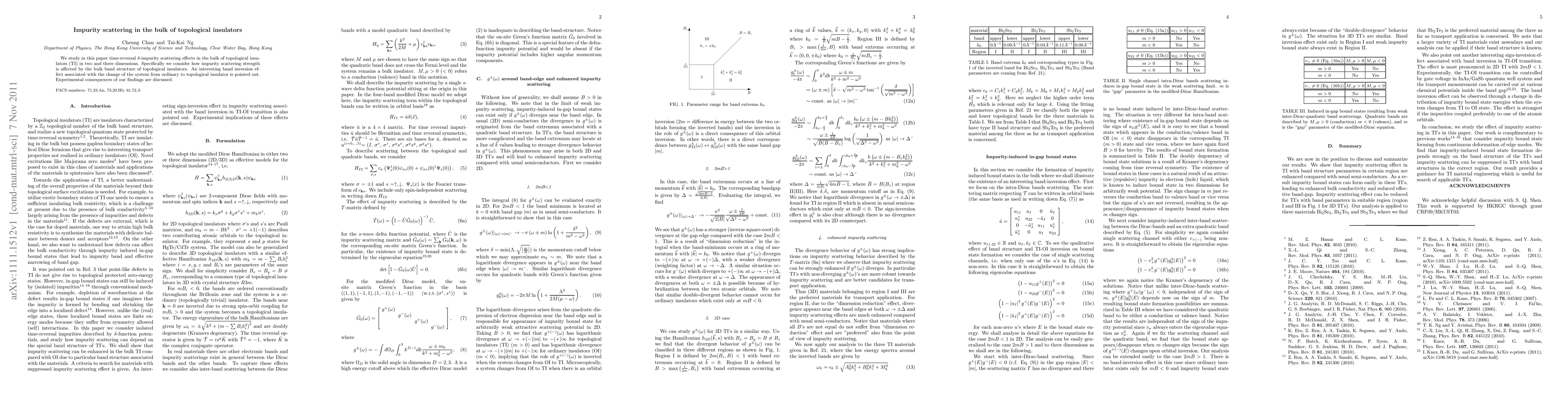 We study in this paper time-reversal $\delta$-impurity scattering effects in the bulk of topological insulators (TI) in two and three dimensions. Specifically we consider how impurity scattering strength is affected by the bulk band structure of topological insulators. An interesting band inversion effect associated with the change of the system from ordinary to topological insulator is pointed out. Experimental consequences of our findings are discussed.