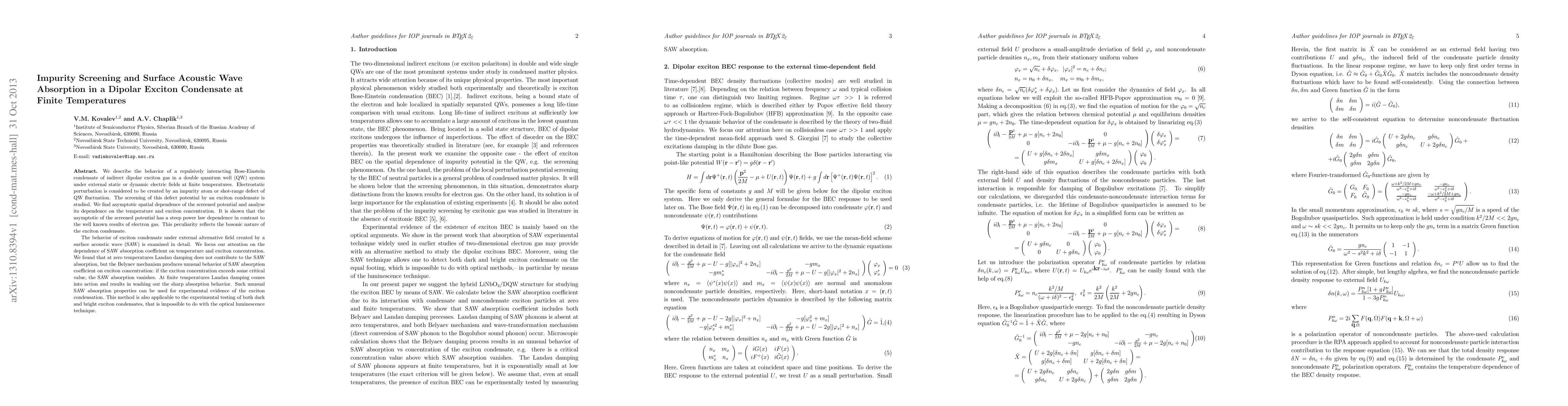 We describe the behavior of a repulsively interacting Bose-Einstein condensate of indirect dipolar exciton gas in a double quantum well (QW) system under external static or dynamic electric fields at finite temperatures. Electrostatic perturbation is considered to be created by an impurity atom or shot-range defect of QW fluctuation. The screening of this defect potential by an exciton condensate is studied. We find asymptotic spatial dependence of the screened potential and analyse its dependence on the temperature and exciton concentration. It is shown that the asymptotic of the screened potential has a steep power law dependence in contrast to the well known results of electron gas. This peculiarity reflects the bosonic nature of the exciton condensate. The behavior of exciton condensate under external alternative field created by a surface acoustic wave (SAW) is examined in detail. We focus our attention on the dependence of SAW absorption coefficient on temperature and exciton concentration. We found that at zero temperatures Landau damping does not contribute to the SAW absorption, but the Belyaev mechanism produces unusual behavior of SAW absorption coefficient on exciton concentration: if the exciton concentration exceeds some critical value, the SAW absorption vanishes. At finite temperatures Landau damping comes into action and results in washing out the sharp absorption behavior. Such unusual SAW absorption properties can be used for experimental evidence of the exciton condensation. This method is also applicable to the experimental testing of both dark and bright exciton condensates, that is impossible to do with the optical luminescence technique.