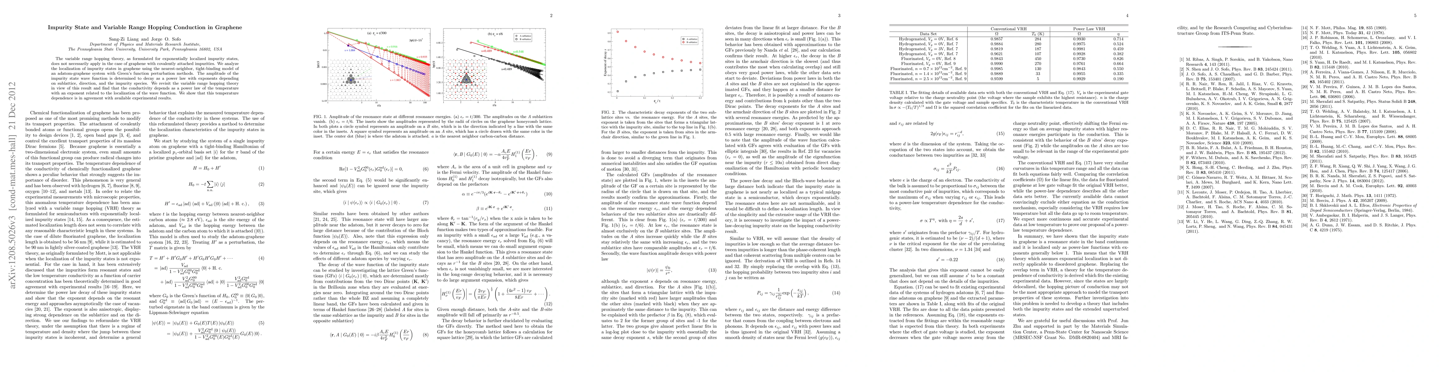 The variable range hopping theory, as formulated for exponentially localized impurity states, does not necessarily apply in the case of graphene with covalently attached impurities. We analyze the localization of impurity states in graphene using the nearest-neighbor, tight-binding model of an adatom-graphene system with Green's function perturbation methods. The amplitude of the impurity state wave function is determined to decay as a power law with exponents depending on sublattice, direction, and the impurity species. We revisit the variable range hopping theory in view of this result and find that the conductivity depends as a power law of the temperature with an exponent related to the localization of the wave function. We show that this temperature dependence is in agreement with available experimental results.