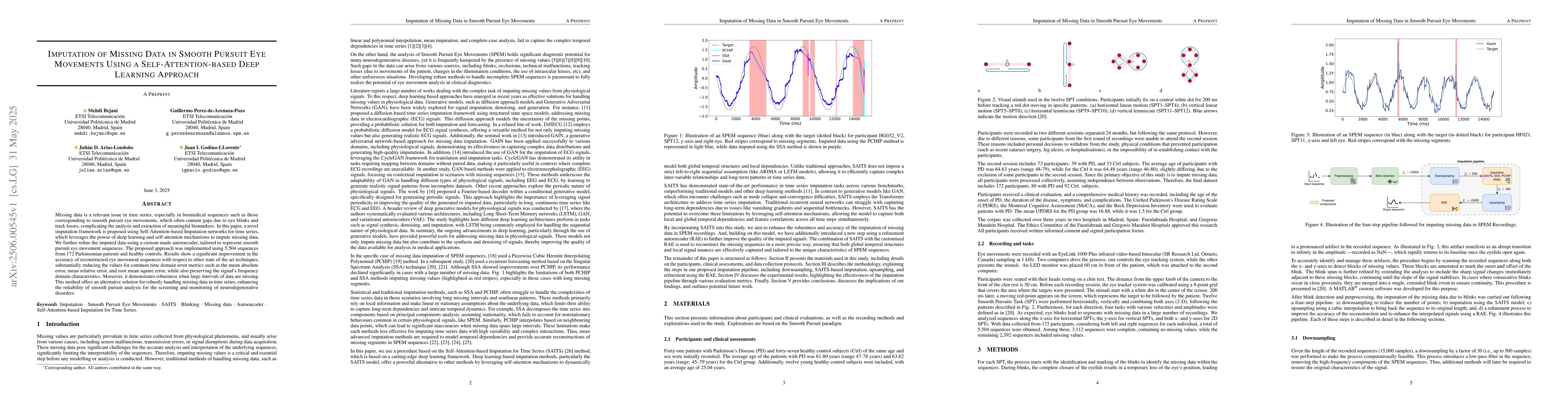 A self-attention-based deep learning approach (SAITS) combined with an autoencoder refinement step was proposed for imputing missing data in smooth pursuit eye movement (SPEM) sequences, using 5,504 sequences from 172 Parkinsonian patients and healthy controls.