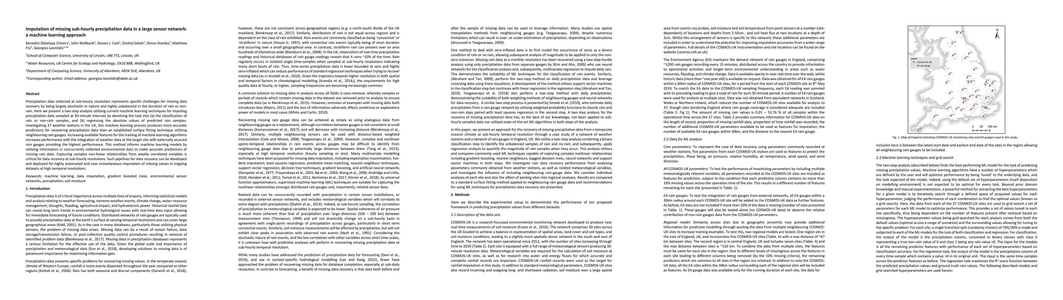 Researchers developed a machine learning approach to impute missing sub-hourly precipitation data, achieving more accurate predictions than existing methods. The technique utilizes environmental data and neighboring rain gauges to improve performance.