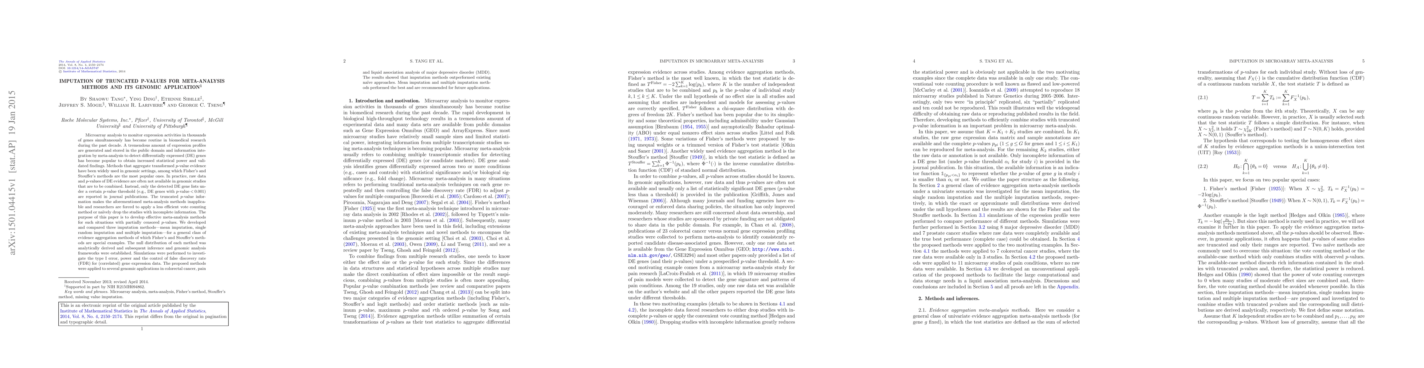 This paper develops imputation methods for truncated p-values in meta-analysis, addressing the issue of incomplete data in genomic studies. The proposed mean, single random, and multiple imputation techniques were shown to outperform naive methods in simulations and genomic applications, with mean and multiple imputation methods recommended for future use.