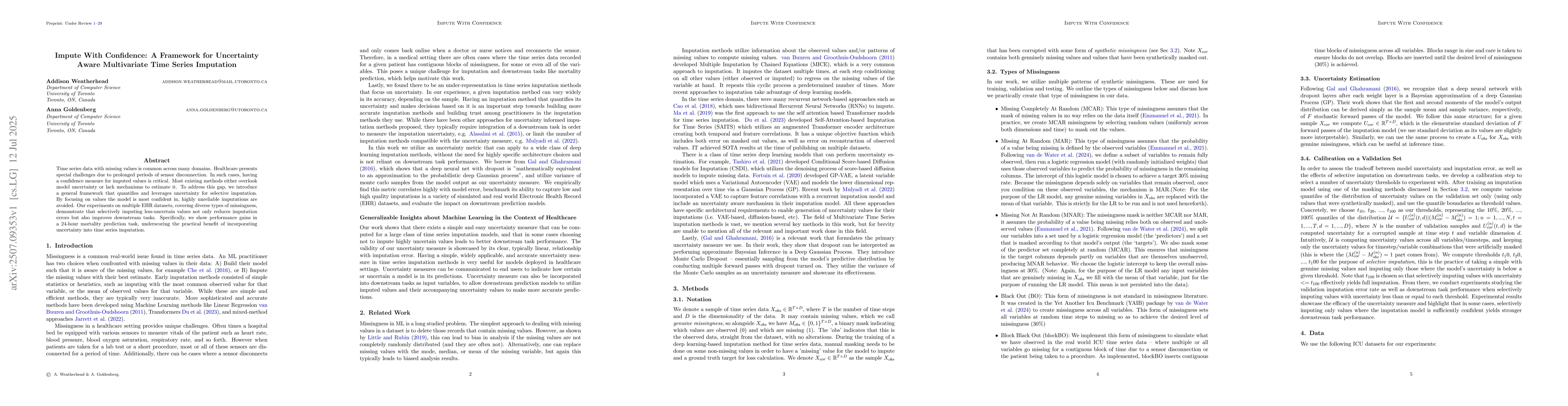 Time series data with missing values is common across many domains. Healthcare presents special challenges due to prolonged periods of sensor disconnection. In such cases, having a confidence measure for imputed values is critical. Most existing methods either overlook model uncertainty or lack mechanisms to estimate it. To address this gap, we introduce a general framework that quantifies and leverages uncertainty for selective imputation. By focusing on values the model is most confident in, highly unreliable imputations are avoided. Our experiments on multiple EHR datasets, covering diverse types of missingness, demonstrate that selectively imputing less-uncertain values not only reduces imputation errors but also improves downstream tasks. Specifically, we show performance gains in a 24-hour mortality prediction task, underscoring the practical benefit of incorporating uncertainty into time series imputation.