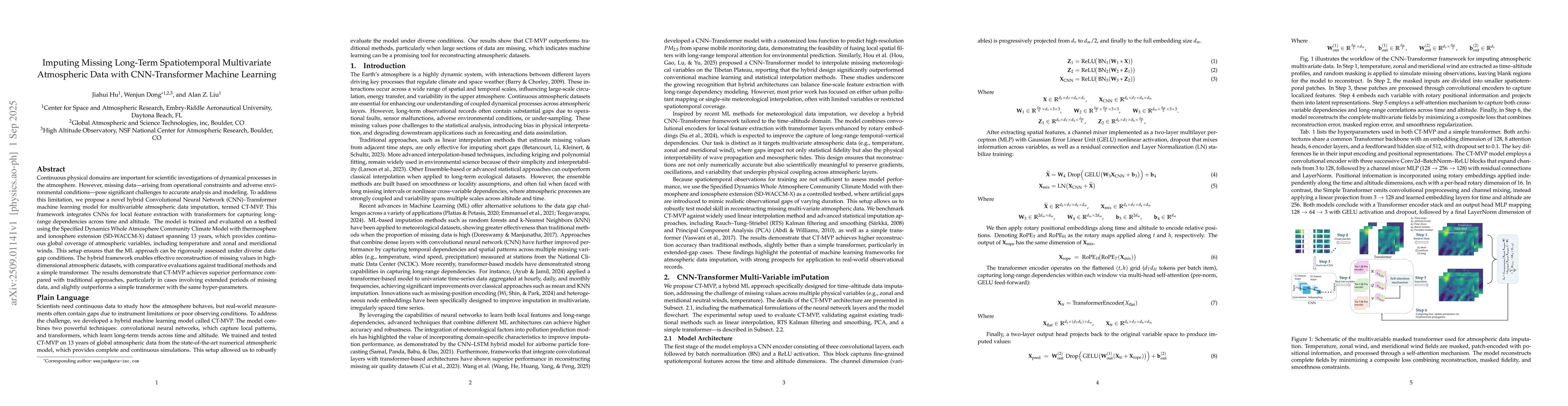 Continuous physical domains are important for scientific investigations of dynamical processes in the atmosphere. However, missing data arising from operational constraints and adverse environmental conditions pose significant challenges to accurate analysis and modeling. To address this limitation, we propose a novel hybrid Convolutional Neural Network (CNN) Transformer machine learning model for multivariable atmospheric data imputation, termed CT-MVP. This framework integrates CNNs for local feature extraction with transformers for capturing long-range dependencies across time and altitude. The model is trained and evaluated on a testbed using the Specified Dynamics Whole Atmosphere Community Climate Model with thermosphere and ionosphere extension (SD-WACCM-X) dataset spanning 13 years, which provides continuous global coverage of atmospheric variables, including temperature and zonal and meridional winds. This setup ensures that the ML approach can be rigorously assessed under diverse data-gap conditions. The hybrid framework enables effective reconstruction of missing values in high-dimensional atmospheric datasets, with comparative evaluations against traditional methods and a simple transformer. The results demonstrate that CT-MVP achieves superior performance compared with traditional approaches, particularly in cases involving extended periods of missing data, and slightly outperforms a simple transformer with the same hyper-parameters.