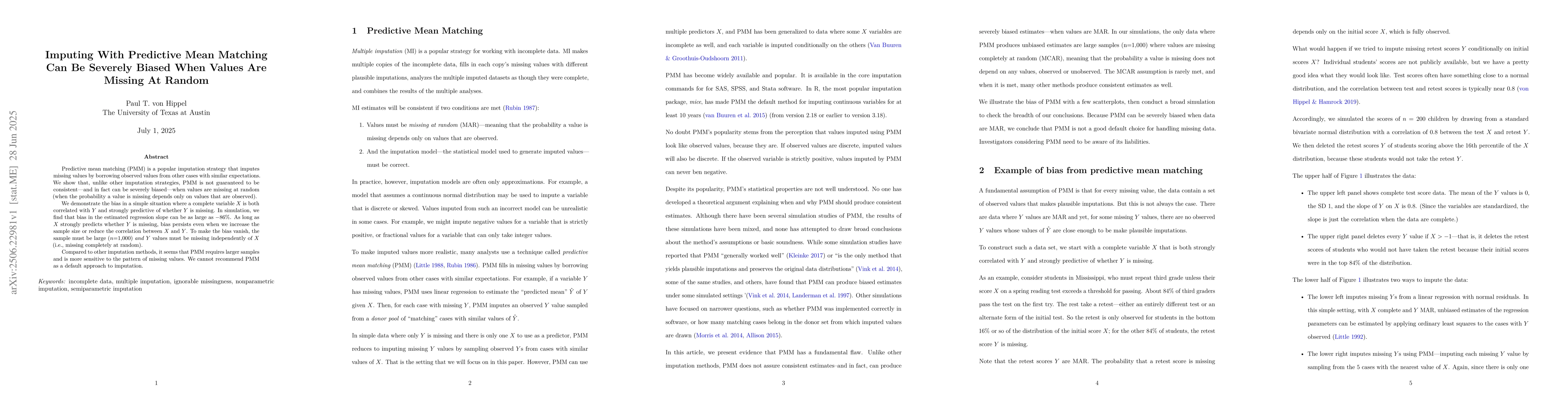 Predictive mean matching (PMM) is a popular imputation strategy that imputes missing values by borrowing observed values from other cases with similar expectations. We show that, unlike other imputation strategies, PMM is not guaranteed to be consistent -- and in fact can be severely biased -- when values are missing at random (when the probability a value is missing depends only on values that are observed). We demonstrate the bias in a simple situation where a complete variable $X$ is both strongly correlated with $Y$ and strongly predictive of whether $Y$ is missing. The bias in the estimated regression slope can be as large as 80 percent, and persists even when we reduce the correlation between $X$ and $Y$. To make the bias vanish, the sample must be large ($n$=1,000) \emph{and} $Y$ values must be missing independently of $X$ (i.e., missing completely at random). Compared to other imputation methods, it seems that PMM requires larger samples and is more sensitive to the pattern of missing values. We cannot recommend PMM as a default approach to imputation.