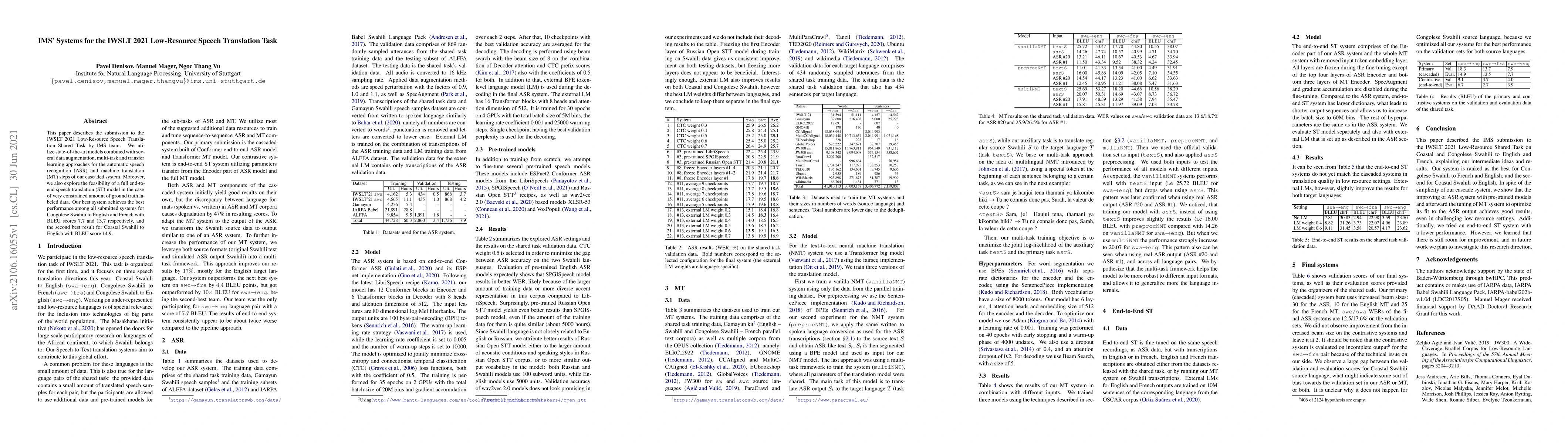 IMS team submitted a state-of-the-art cascaded system for the IWSLT 2021 Low-Resource Speech Translation Task, combining ASR and MT with data augmentation and transfer learning. Their best system achieved top results for Congolese Swahili to English and French, and second best for Coastal Swahili to English.