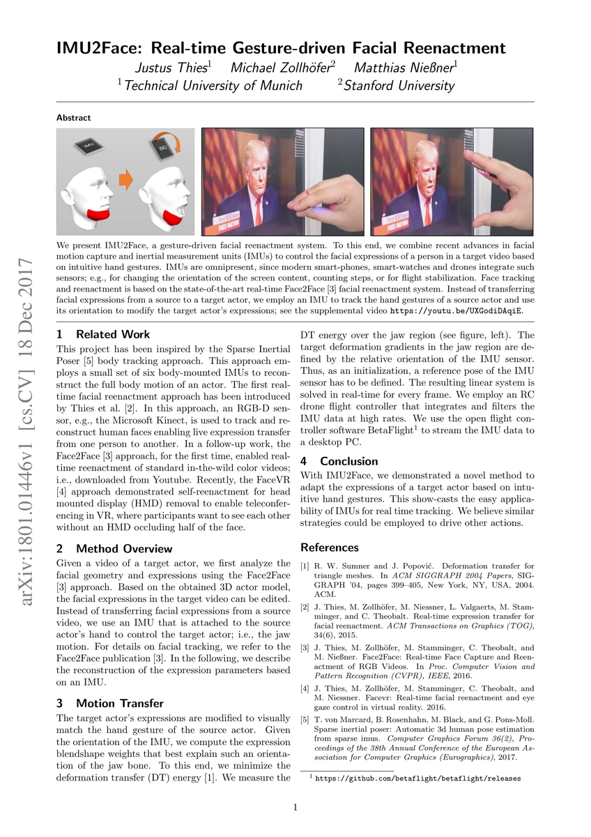 IMU2Face combines recent advances in facial motion capture and inertial measurement units (IMUs) to control facial expressions of a person in a target video using intuitive hand gestures. It builds upon the real-time Face2Face facial reenactment system, employing an IMU attached to a source actor's hand to modify the target actor's expressions based on the IMU's orientation.