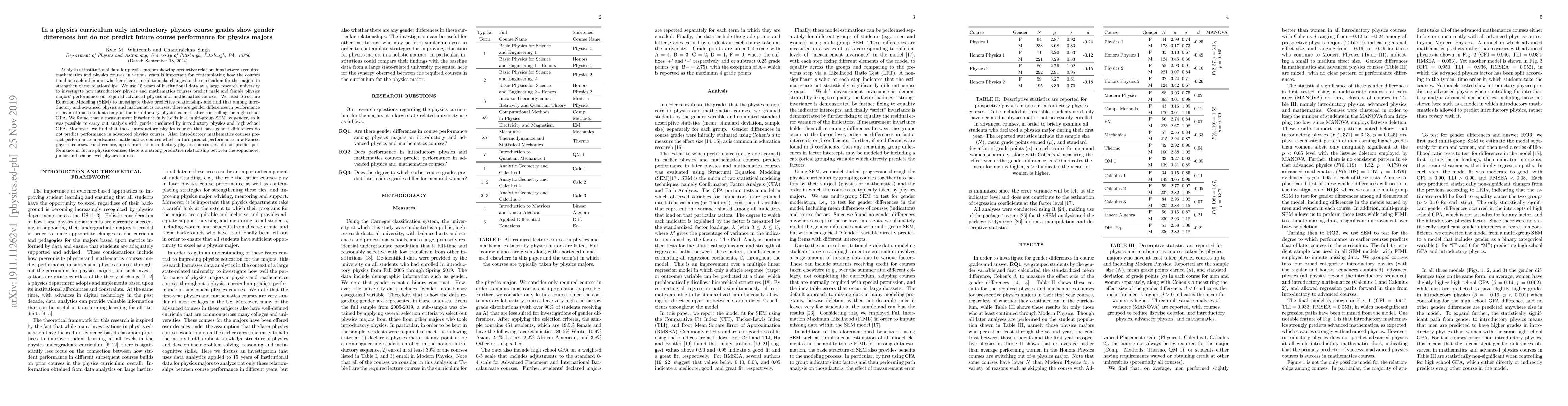 This study analyzes 15 years of data from a large research university to determine if introductory physics course grades show gender differences and predict future performance in physics majors. It finds that while male students outperform females in introductory physics, these differences do not predict success in advanced physics courses, whereas advanced mathematics courses do predict future performance.