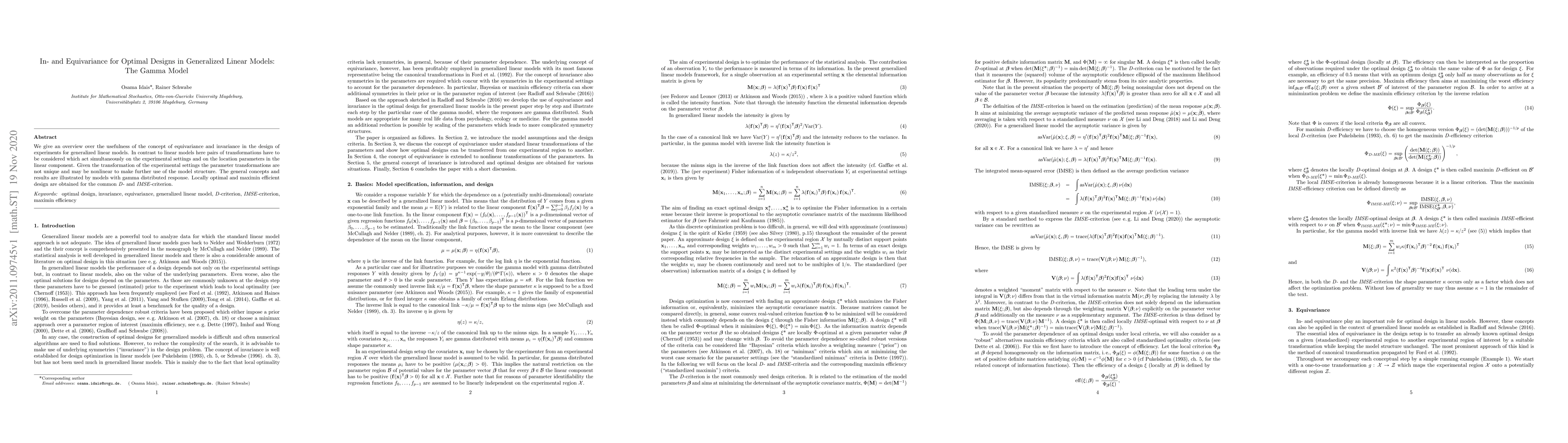 This paper explores the application of equivariance and invariance in designing optimal experiments for generalized linear models, particularly focusing on the gamma model. It highlights the necessity of considering paired transformations that affect both the experimental settings and the location parameters, leading to locally optimal and maximin efficient designs under D- and IMSE-criteria.