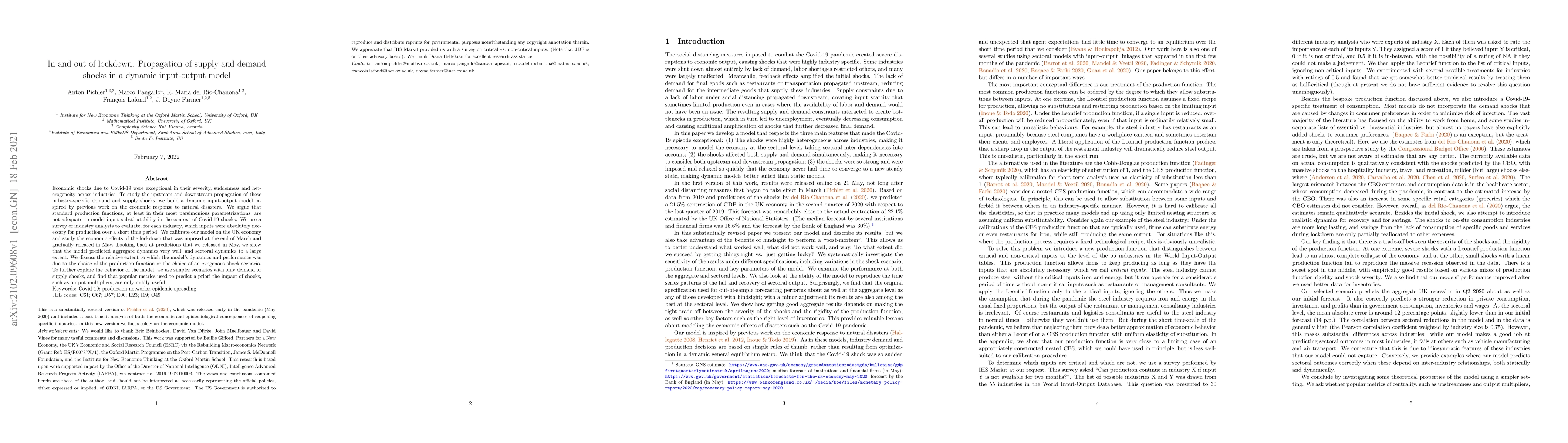 Economic shocks due to Covid-19 were exceptional in their severity, suddenness and heterogeneity across industries. To study the upstream and downstream propagation of these industry-specific demand and supply shocks, we build a dynamic input-output model inspired by previous work on the economic response to natural disasters. We argue that standard production functions, at least in their most parsimonious parametrizations, are not adequate to model input substitutability in the context of Covid-19 shocks. We use a survey of industry analysts to evaluate, for each industry, which inputs were absolutely necessary for production over a short time period. We calibrate our model on the UK economy and study the economic effects of the lockdown that was imposed at the end of March and gradually released in May. Looking back at predictions that we released in May, we show that the model predicted aggregate dynamics very well, and sectoral dynamics to a large extent. We discuss the relative extent to which the model's dynamics and performance was due to the choice of the production function or the choice of an exogenous shock scenario. To further explore the behavior of the model, we use simpler scenarios with only demand or supply shocks, and find that popular metrics used to predict a priori the impact of shocks, such as output multipliers, are only mildly useful.