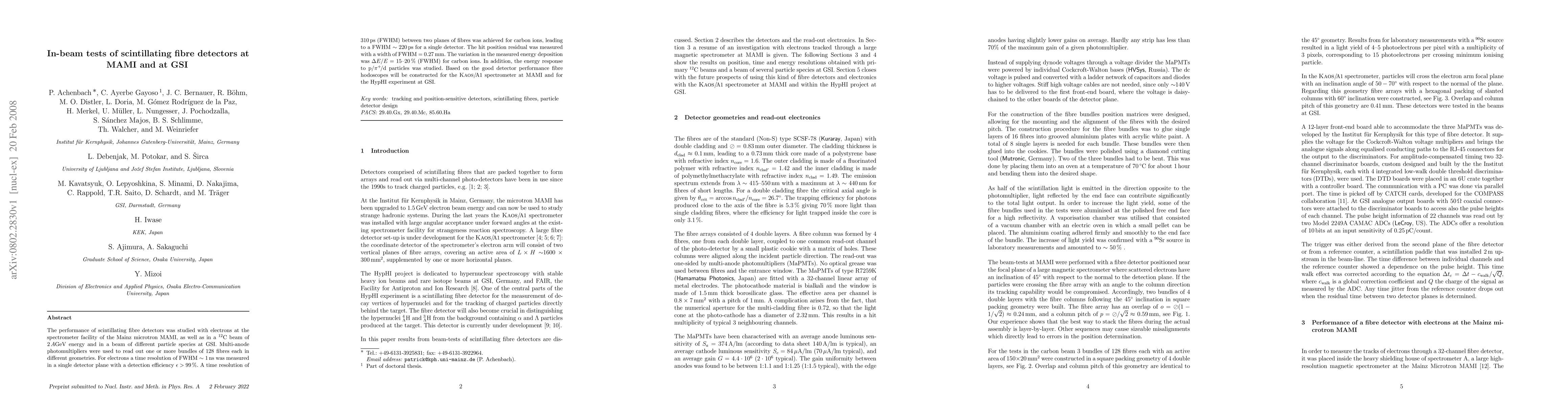 This study evaluates the performance of scintillating fibre detectors using electron beams at MAMI and carbon ion beams at GSI, achieving a time resolution of 1 ns for electrons and 310 ps for carbon ions, with high detection efficiency and precise position resolution. The results support the use of these detectors in future experiments at MAMI and GSI.