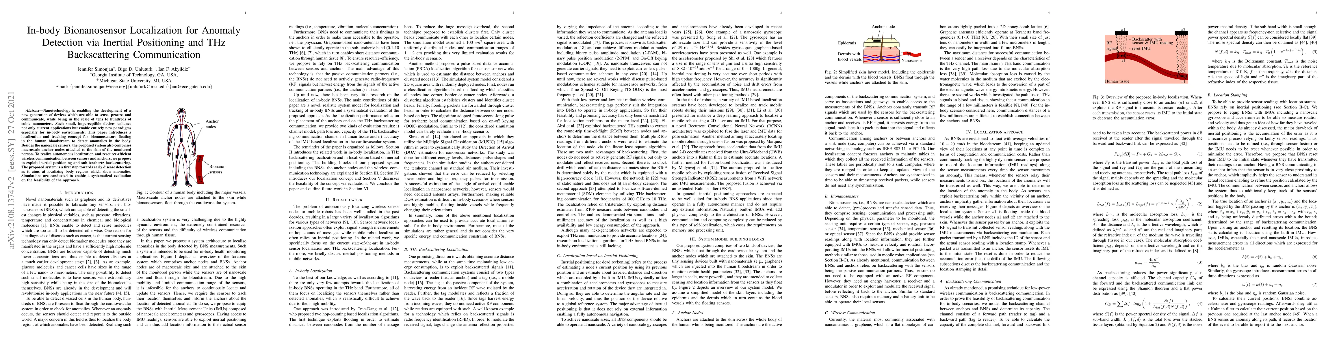 Nanotechnology is enabling the development of a new generation of devices which are able to sense, process and communicate, while being in the scale of tens to hundreds of cubic nanometers. Such small, imperceptible devices enhance not only current applications but enable entirely new paradigms especially for in-body environments. This paper introduces a localization and tracking concept for bionanosensors floating in the human bloodstream to detect anomalies in the body. Besides the nanoscale sensors, the proposed system also comprises macroscale anchor nodes attached to the skin of the monitored person. To realize autonomous localization and resource-efficient wireless communication between sensors and anchors, we propose to exploit inertial positioning and sub-terahertz backscattering. The proposed system is a first step towards early disease detection as it aims at localizing body regions which show anomalies. Simulations are conducted to enable a systematical evaluation on the feasibility of the approach.