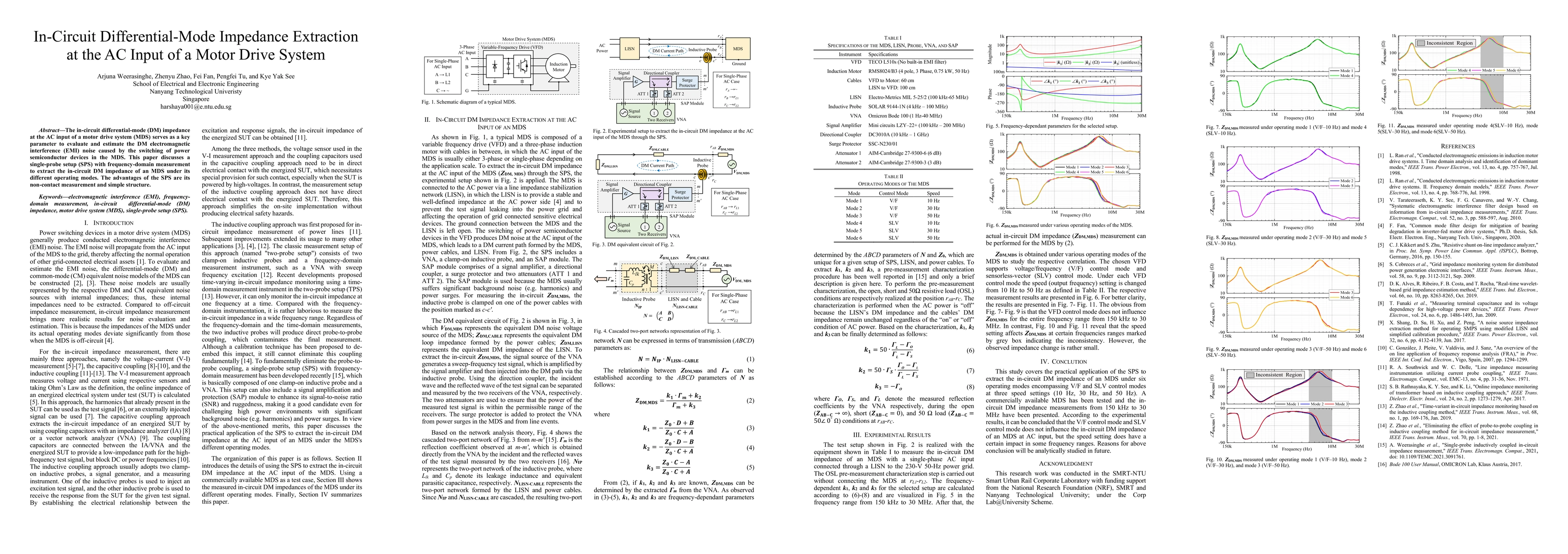 The in-circuit differential-mode (DM) impedance at the AC input of a motor drive system (MDS) serves as a key parameter to evaluate and estimate the DM electromagnetic interference (EMI) noise caused by the switching of power semiconductor devices in the MDS. This paper discusses a single-probe setup (SPS) with frequency-domain measurement to extract the in-circuit DM impedance of an MDS under its different operating modes. The advantages of the SPS are its non-contact measurement and simple structure.