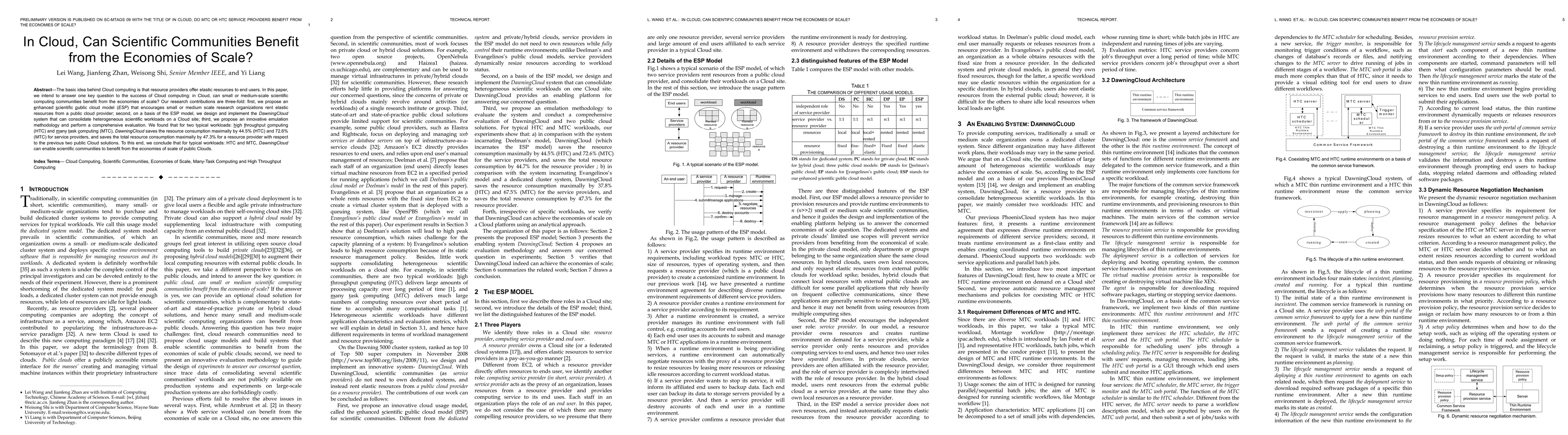 This paper proposes an enhanced scientific public cloud model (ESP) and implements the DawningCloud system to consolidate heterogeneous scientific workloads on a cloud site, demonstrating significant resource savings for both service providers and resource providers, thus showing that small or medium-scale scientific communities can benefit from the economies of scale offered by cloud computing.