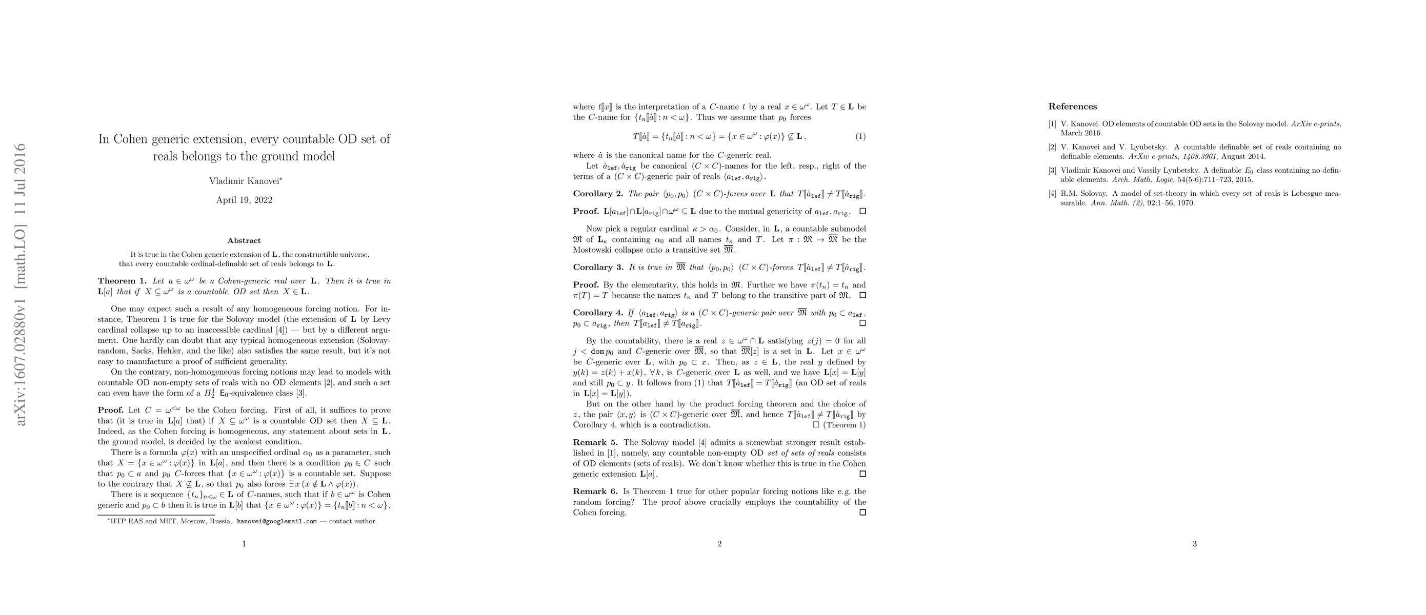 Summary: In Cohen generic extensions of L, the constructible universe, every countable set of reals that is ordinal-definable remains within L. This demonstrates the preservation of certain definable properties in the generic extension.