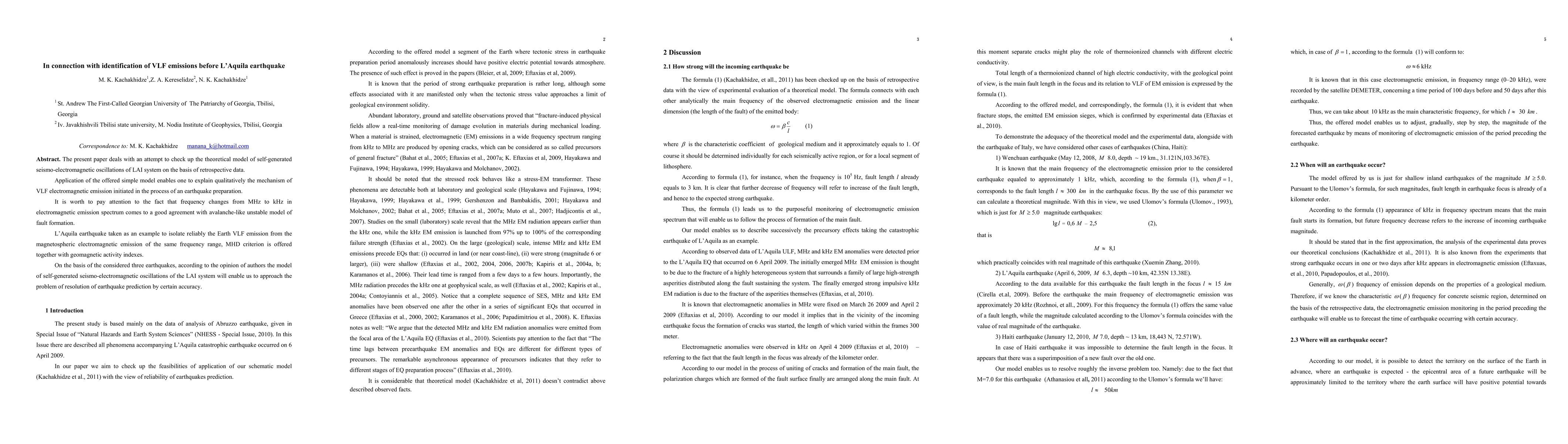 The present paper deals with an attempt to check up the theoretical model of self-generated seismo-electromagnetic oscillations of LAI system on the basis of retrospective data. Application of the offered simple model enables one to explain qualitatively the mechanism of VLF electromagnetic emission initiated in the process of an earthquake preparation. It is worth to pay attention to the fact that frequency changes from MHz to kHz in electromagnetic emission spectrum comes to a good agreement with avalanche-like unstable model of fault formation. L'Aquila earthquake taken as an example to isolate reliably the Earth VLF emission from the magnetospheric electromagnetic emission of the same frequency range, MHD criterion is offered together with geomagnetic activity indexes. On the basis of the considered three earthquakes, according to the opinion of authors the model of self-generated seismo-electromagnetic oscillations of the LAI system will enable us to approach the problem of resolution of earthquake prediction by certain accuracy.
