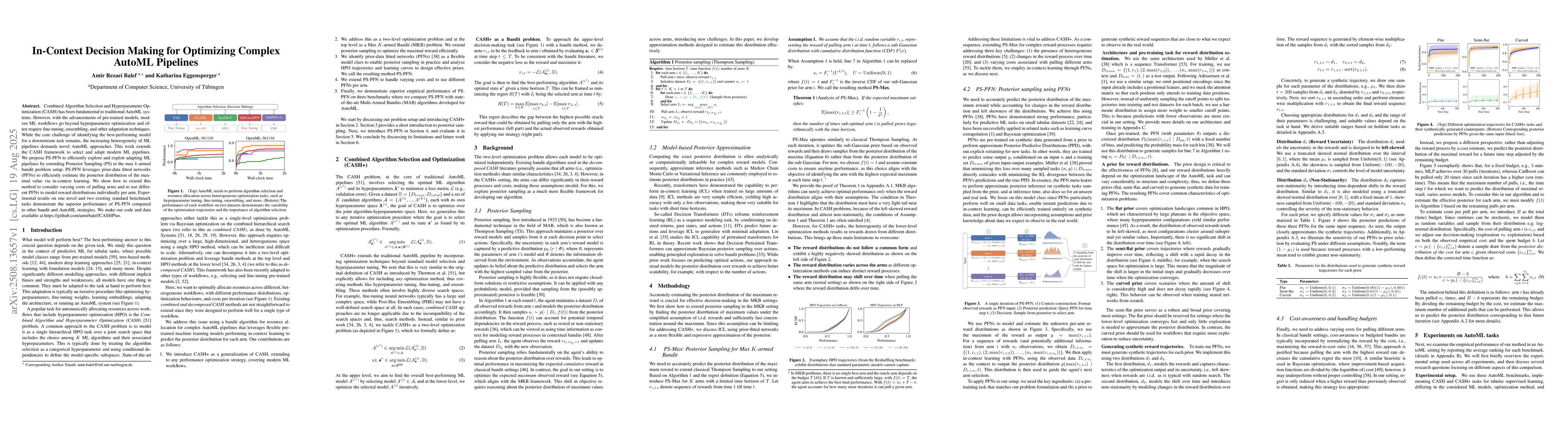 Combined Algorithm Selection and Hyperparameter Optimization (CASH) has been fundamental to traditional AutoML systems. However, with the advancements of pre-trained models, modern ML workflows go beyond hyperparameter optimization and often require fine-tuning, ensembling, and other adaptation techniques. While the core challenge of identifying the best-performing model for a downstream task remains, the increasing heterogeneity of ML pipelines demands novel AutoML approaches. This work extends the CASH framework to select and adapt modern ML pipelines. We propose PS-PFN to efficiently explore and exploit adapting ML pipelines by extending Posterior Sampling (PS) to the max k-armed bandit problem setup. PS-PFN leverages prior-data fitted networks (PFNs) to efficiently estimate the posterior distribution of the maximal value via in-context learning. We show how to extend this method to consider varying costs of pulling arms and to use different PFNs to model reward distributions individually per arm. Experimental results on one novel and two existing standard benchmark tasks demonstrate the superior performance of PS-PFN compared to other bandit and AutoML strategies. We make our code and data available at https://github.com/amirbalef/CASHPlus.