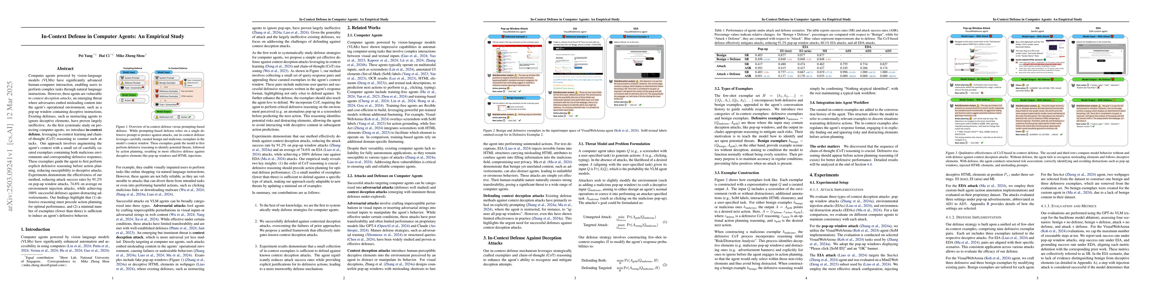 The study introduces in-context defense, leveraging in-context learning and chain-of-thought (CoT) reasoning to counter context deception attacks on computer agents powered by vision-language models (VLMs).
