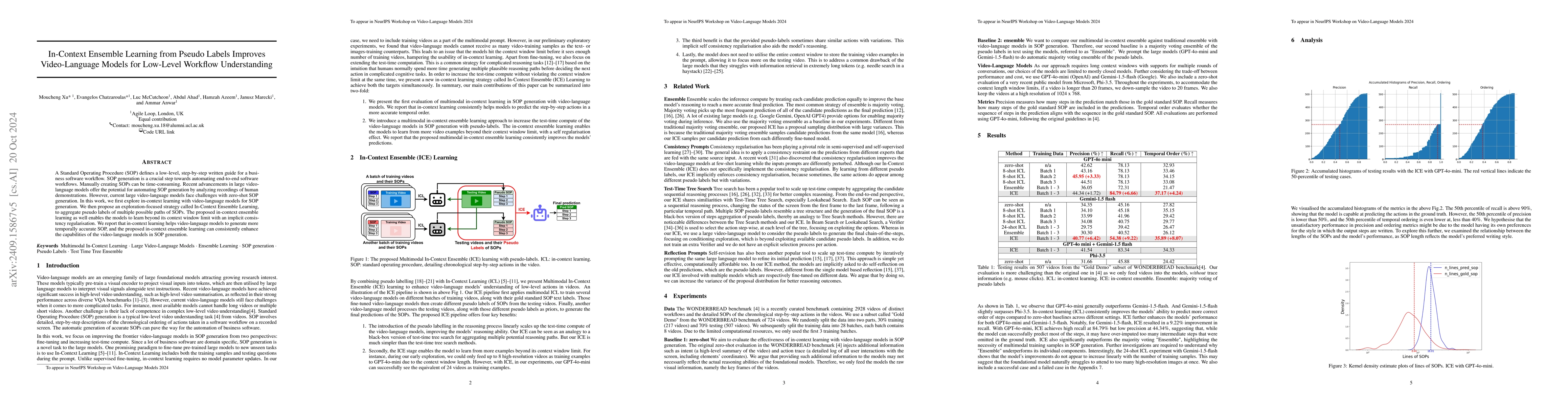 A Standard Operating Procedure (SOP) defines a low-level, step-by-step written guide for a business software workflow based on a video demonstration. SOPs are a crucial step toward automating end-to-end software workflows. Manually creating SOPs can be time-consuming. Recent advancements in large video-language models offer the potential for automating SOP generation by analyzing recordings of human demonstrations. However, current large video-language models face challenges with zero-shot SOP generation. We explore in-context learning with video-language models for SOP generation. We report that in-context learning sometimes helps video-language models at SOP generation. We then propose an in-context ensemble learning to further enhance the capabilities of the models in SOP generation.