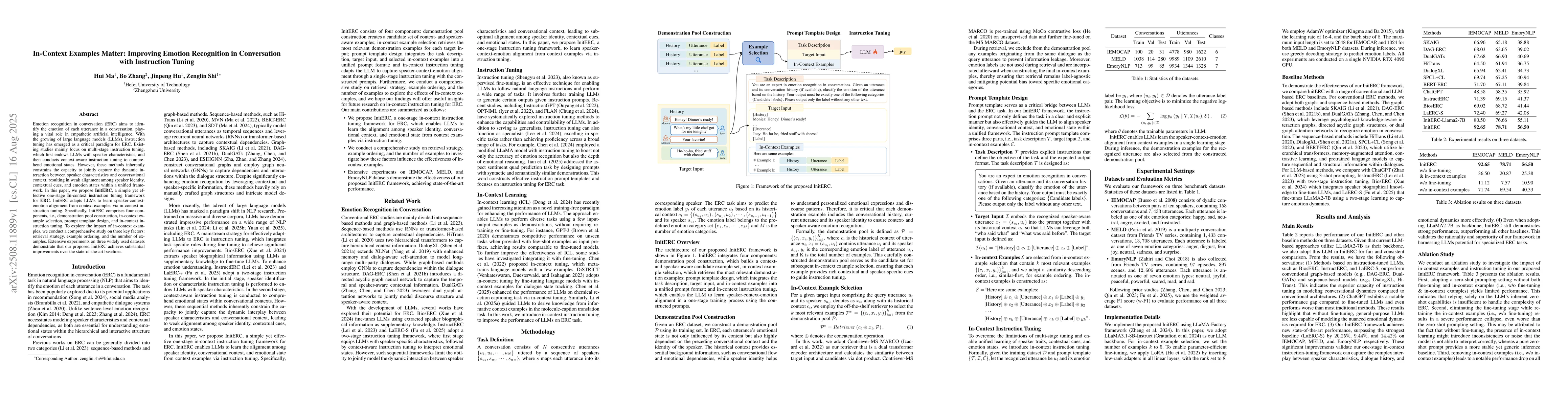 Emotion recognition in conversation (ERC) aims to identify the emotion of each utterance in a conversation, playing a vital role in empathetic artificial intelligence. With the growing of large language models (LLMs), instruction tuning has emerged as a critical paradigm for ERC. Existing studies mainly focus on multi-stage instruction tuning, which first endows LLMs with speaker characteristics, and then conducts context-aware instruction tuning to comprehend emotional states. However, these methods inherently constrains the capacity to jointly capture the dynamic interaction between speaker characteristics and conversational context, resulting in weak alignment among speaker identity, contextual cues, and emotion states within a unified framework. In this paper, we propose InitERC, a simple yet effective one-stage in-context instruction tuning framework for ERC. InitERC adapts LLMs to learn speaker-context-emotion alignment from context examples via in-context instruction tuning. Specifically, InitERC comprises four components, i.e., demonstration pool construction, in-context example selection, prompt template design, and in-context instruction tuning. To explore the impact of in-context examples, we conduct a comprehensive study on three key factors: retrieval strategy, example ordering, and the number of examples. Extensive experiments on three widely used datasets demonstrate that our proposed InitERC achieves substantial improvements over the state-of-the-art baselines.