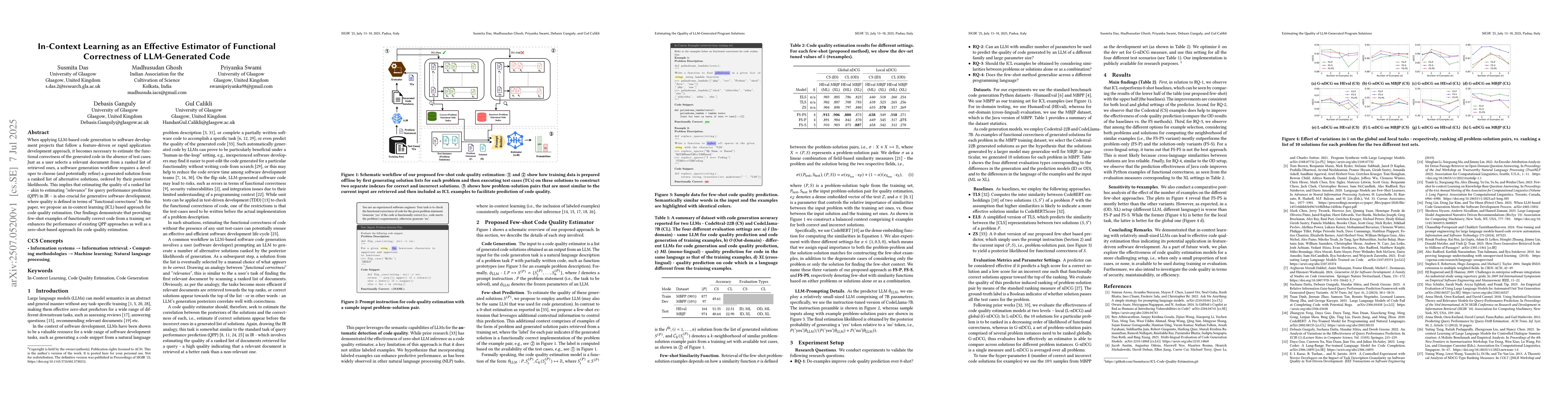 When applying LLM-based code generation to software development projects that follow a feature-driven or rapid application development approach, it becomes necessary to estimate the functional correctness of the generated code in the absence of test cases. Just as a user selects a relevant document from a ranked list of retrieved ones, a software generation workflow requires a developer to choose (and potentially refine) a generated solution from a ranked list of alternative solutions, ordered by their posterior likelihoods. This implies that estimating the quality of a ranked list -- akin to estimating "relevance" for query performance prediction (QPP) in IR -- is also crucial for generative software development, where quality is defined in terms of "functional correctness". In this paper, we propose an in-context learning (ICL) based approach for code quality estimation. Our findings demonstrate that providing few-shot examples of functionally correct code from a training set enhances the performance of existing QPP approaches as well as a zero-shot-based approach for code quality estimation.