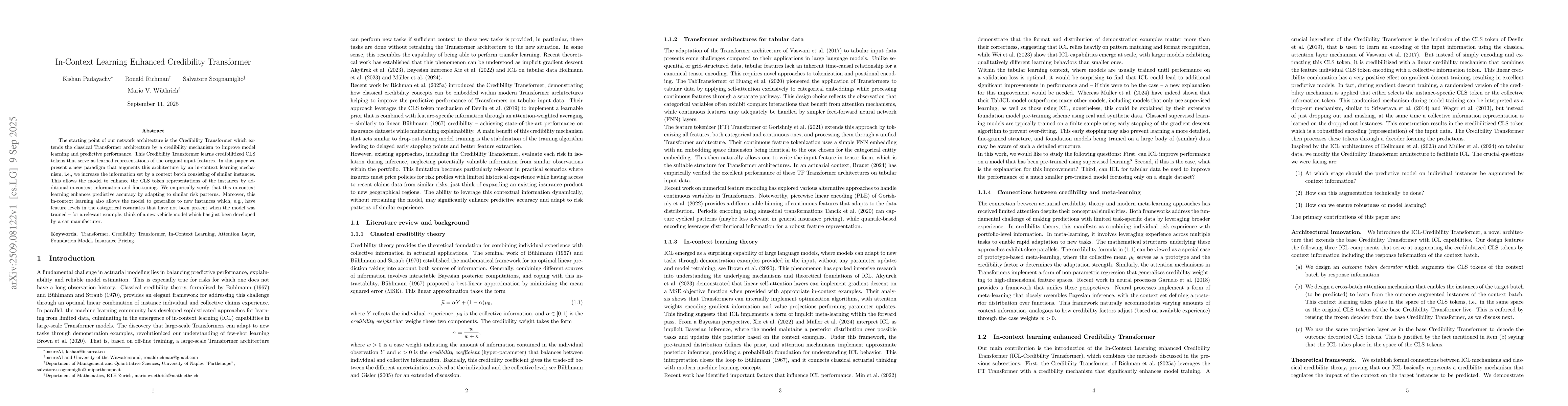 The starting point of our network architecture is the Credibility Transformer which extends the classical Transformer architecture by a credibility mechanism to improve model learning and predictive performance. This Credibility Transformer learns credibilitized CLS tokens that serve as learned representations of the original input features. In this paper we present a new paradigm that augments this architecture by an in-context learning mechanism, i.e., we increase the information set by a context batch consisting of similar instances. This allows the model to enhance the CLS token representations of the instances by additional in-context information and fine-tuning. We empirically verify that this in-context learning enhances predictive accuracy by adapting to similar risk patterns. Moreover, this in-context learning also allows the model to generalize to new instances which, e.g., have feature levels in the categorical covariates that have not been present when the model was trained -- for a relevant example, think of a new vehicle model which has just been developed by a car manufacturer.