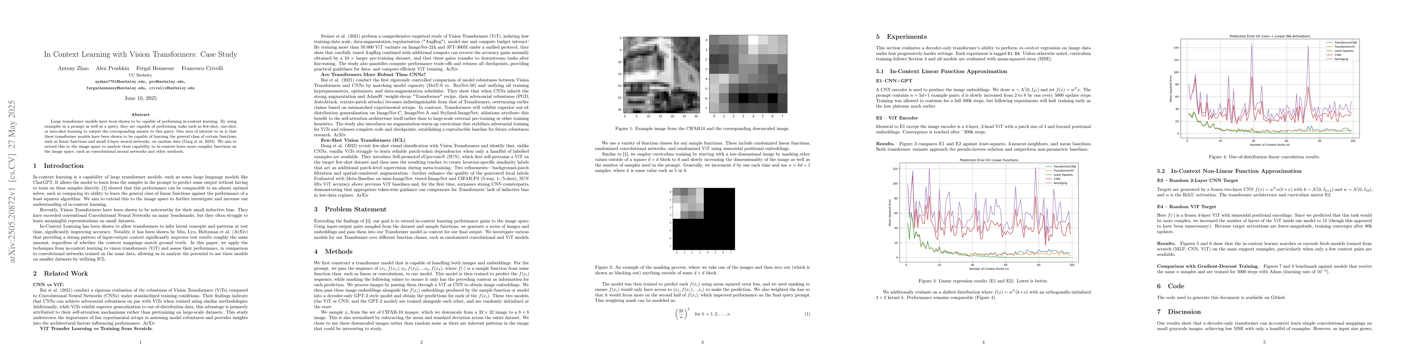 Large transformer models have been shown to be capable of performing in-context learning. By using examples in a prompt as well as a query, they are capable of performing tasks such as few-shot, one-shot, or zero-shot learning to output the corresponding answer to this query. One area of interest to us is that these transformer models have been shown to be capable of learning the general class of certain functions, such as linear functions and small 2-layer neural networks, on random data (Garg et al, 2023). We aim to extend this to the image space to analyze their capability to in-context learn more complex functions on the image space, such as convolutional neural networks and other methods.