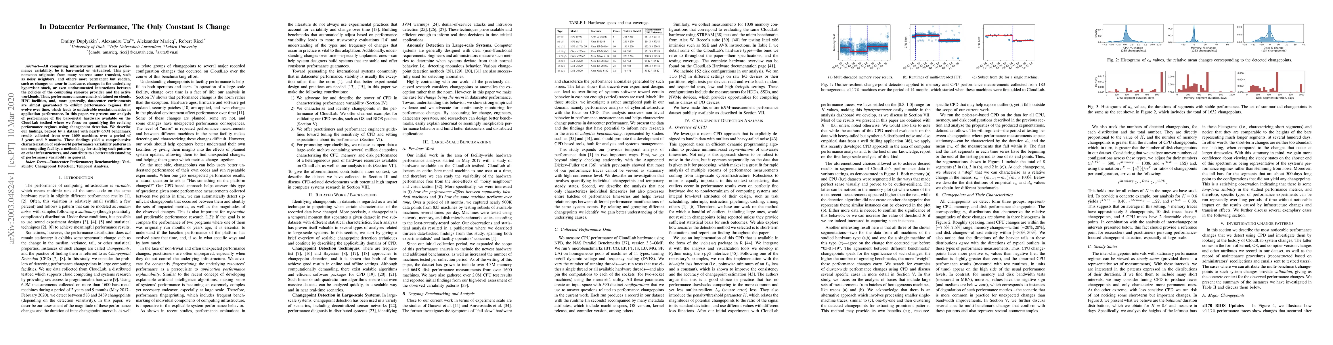 A study analyzed 6.9M benchmark results from 1600 machines over 2 years to characterize performance variability in datacenter environments, identifying evolving performance regimes using changepoint detection.