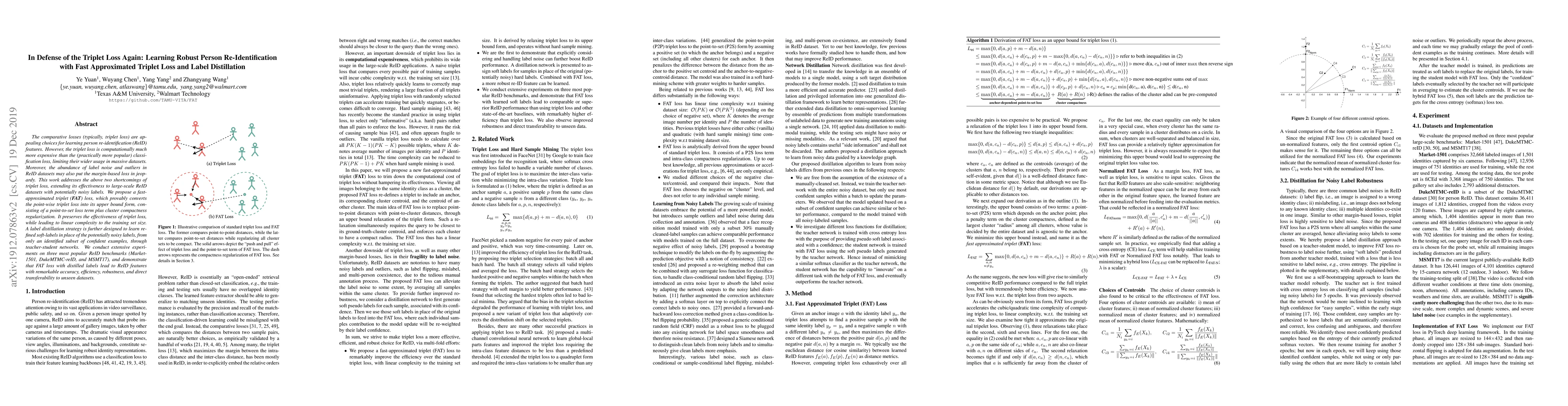 The comparative losses (typically, triplet loss) are appealing choices for learning person re-identification (ReID) features. However, the triplet loss is computationally much more expensive than the (practically more popular) classification loss, limiting their wider usage in massive datasets. Moreover, the abundance of label noise and outliers in ReID datasets may also put the margin-based loss in jeopardy. This work addresses the above two shortcomings of triplet loss, extending its effectiveness to large-scale ReID datasets with potentially noisy labels. We propose a fast-approximated triplet (FAT) loss, which provably converts the point-wise triplet loss into its upper bound form, consisting of a point-to-set loss term plus cluster compactness regularization. It preserves the effectiveness of triplet loss, while leading to linear complexity to the training set size. A label distillation strategy is further designed to learn refined soft-labels in place of the potentially noisy labels, from only an identified subset of confident examples, through teacher-student networks. We conduct extensive experiments on three most popular ReID benchmarks (Market-1501, DukeMTMC-reID, and MSMT17), and demonstrate that FAT loss with distilled labels lead to ReID features with remarkable accuracy, efficiency, robustness, and direct transferability to unseen datasets.