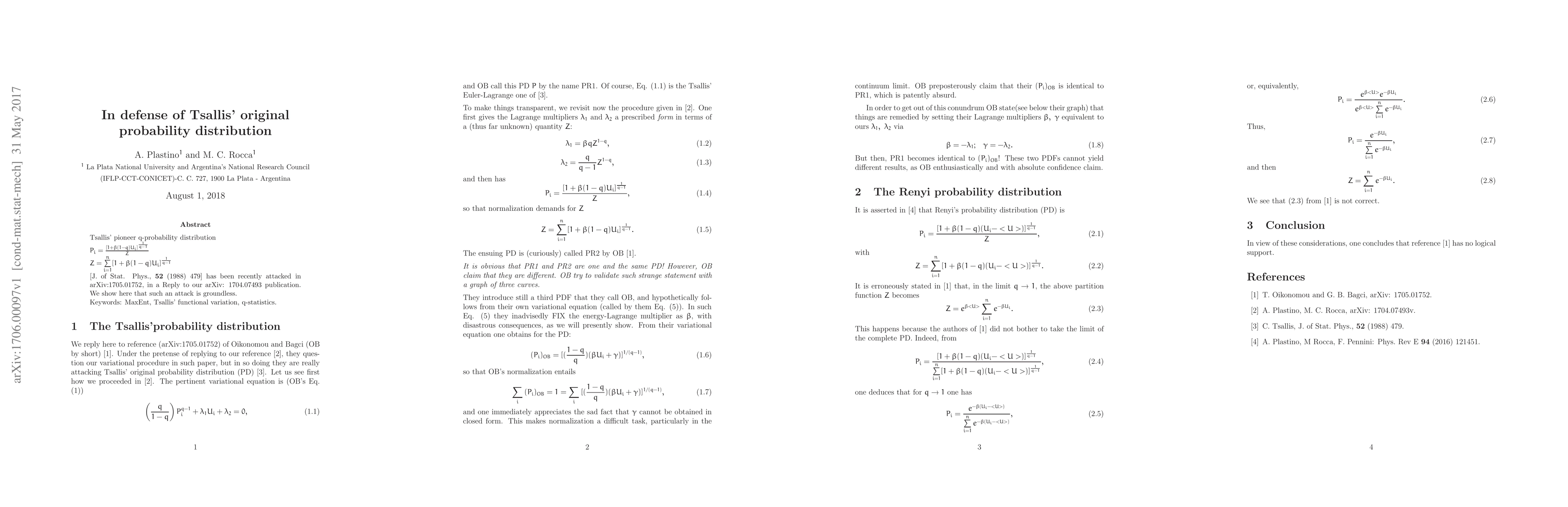 Tsallis' pioneer q-probability distribution $P_i=\frac {[1+\beta(1-q)U_i]^{\frac {1} {q-1}}} {Z}$, $Z=\sum\limits_{i=1}^n [1+\beta(1-q)U_i]^{\frac {1} {q-1}}$ [J. of Stat. Phys., {\bf 52} (1988) 479] has been recently attacked in arXiv:1705.01752, in a Reply to our arXiv:1704.07493 publication. We show here that such an attack is groundless.