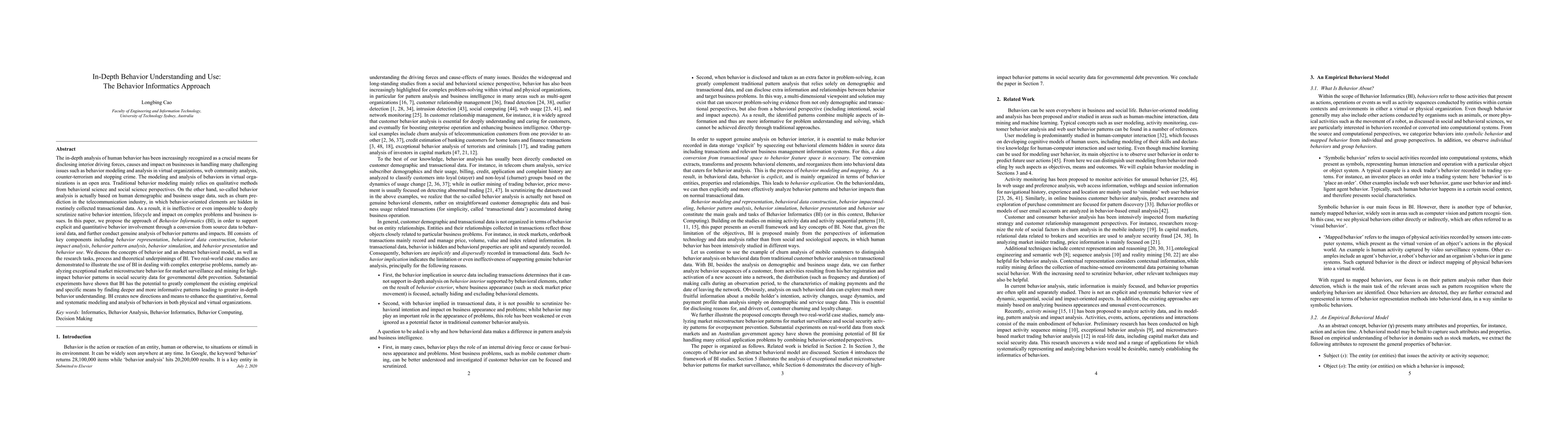 The in-depth analysis of human behavior has been increasingly recognized as a crucial means for disclosing interior driving forces, causes and impact on businesses in handling many challenging issues. The modeling and analysis of behaviors in virtual organizations is an open area. Traditional behavior modeling mainly relies on qualitative methods from behavioral science and social science perspectives. The so-called behavior analysis is actually based on human demographic and business usage data, where behavior-oriented elements are hidden in routinely collected transactional data. As a result, it is ineffective or even impossible to deeply scrutinize native behavior intention, lifecycle and impact on complex problems and business issues. We propose the approach of Behavior Informatics (BI), in order to support explicit and quantitative behavior involvement through a conversion from source data to behavioral data, and further conduct genuine analysis of behavior patterns and impacts. BI consists of key components including behavior representation, behavioral data construction, behavior impact analysis, behavior pattern analysis, behavior simulation, and behavior presentation and behavior use. We discuss the concepts of behavior and an abstract behavioral model, as well as the research tasks, process and theoretical underpinnings of BI. Substantial experiments have shown that BI has the potential to greatly complement the existing empirical and specific means by finding deeper and more informative patterns leading to greater in-depth behavior understanding. BI creates new directions and means to enhance the quantitative, formal and systematic modeling and analysis of behaviors in both physical and virtual organizations.