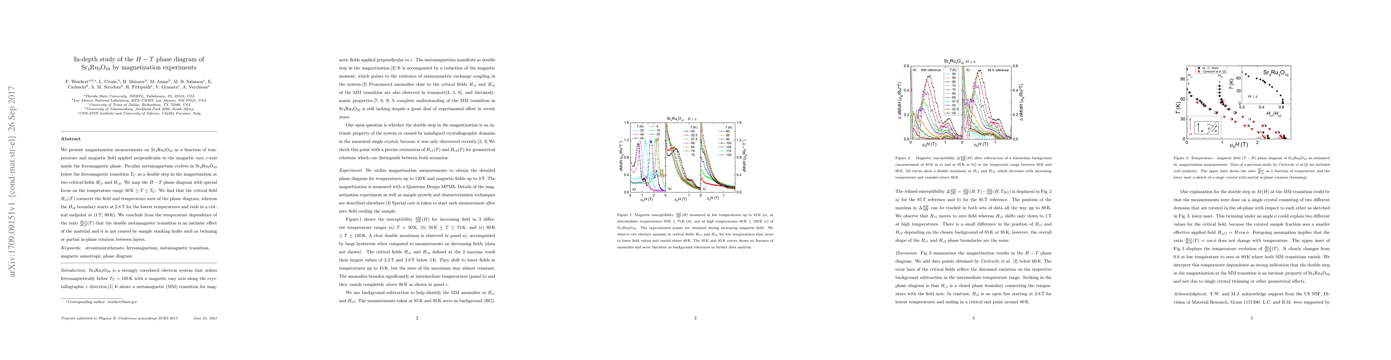 We present magnetization measurements on Sr4Ru3O10 as a function of temperature and magnetic field applied perpendicular to the magnetic easy $c$-axis inside the ferromagnetic phase. Peculiar metamagnetism evolves in Sr4Ru3O10 below the ferromagnetic transition $T_{C}$ as a double step in the magnetization at two critical fields $H_{c1}$ and $H_{c2}$. We map the $H-T$ phase diagram with special focus on the temperature range 50\,K $\le T \le T_{C}$. We find that the critical field $H_{c1}(T)$ connects the field and temperature axes of the phase diagram, whereas the $H_{c2}$ boundary starts at 2.8\,T for the lowest temperatures and ends in a critical endpoint at (1\,T; 80\,K). We conclude from the temperature dependence of the ratio $\frac{Hc1}{Hc2}(T)$ that the double metamagnetic transition is an intrinisc effect of the material and it is not caused by sample stacking faults such as twinning or partial in-plane rotation between layers.