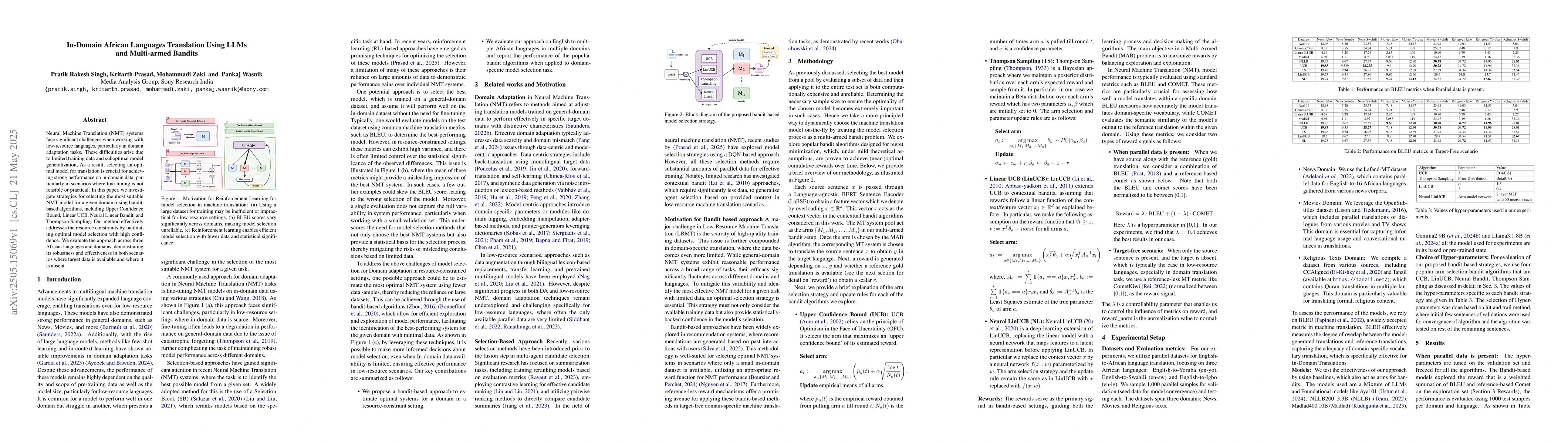 The paper presents a novel application of multi-armed bandit algorithms for model selection in Neural Machine Translation, specifically tailored for in-domain tasks in low-resource languages.