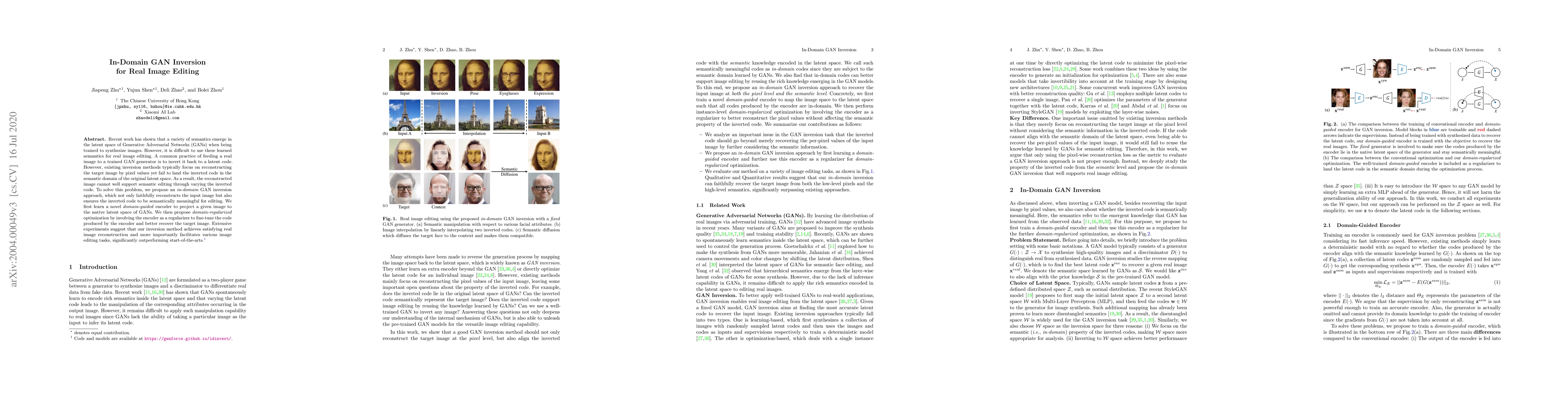 This paper proposes an in-domain GAN inversion method to reconstruct real images while ensuring the inverted latent codes remain semantically meaningful for editing. The method uses a domain-guided encoder and domain-regularized optimization to achieve better image reconstruction and facilitate effective image editing.