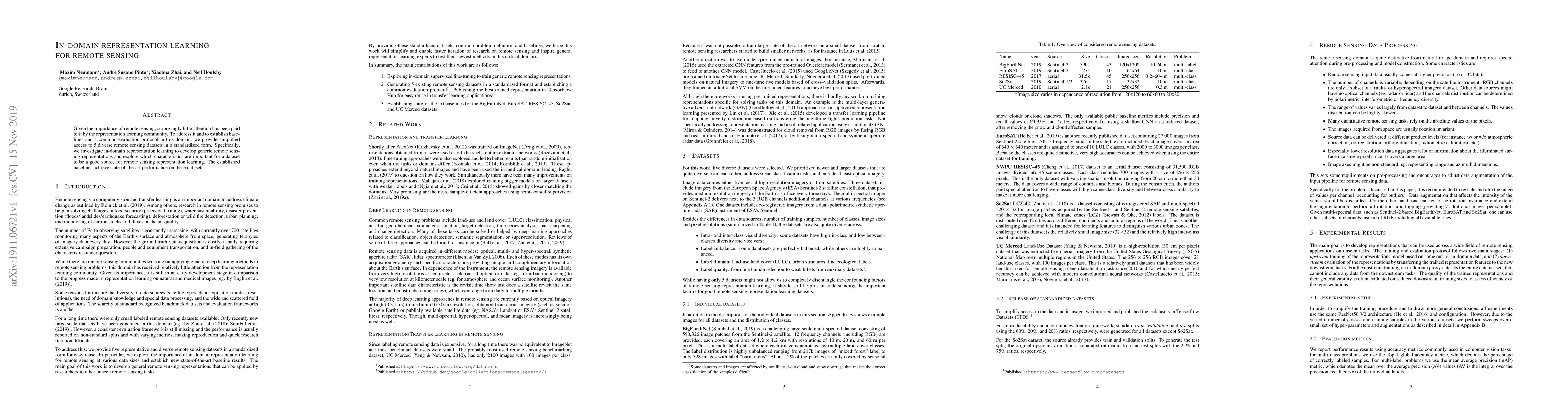 This paper aims to advance representation learning in remote sensing by providing standardized datasets and establishing baselines. It explores in-domain representation learning to develop generic remote sensing models, achieving state-of-the-art performance on the included datasets.