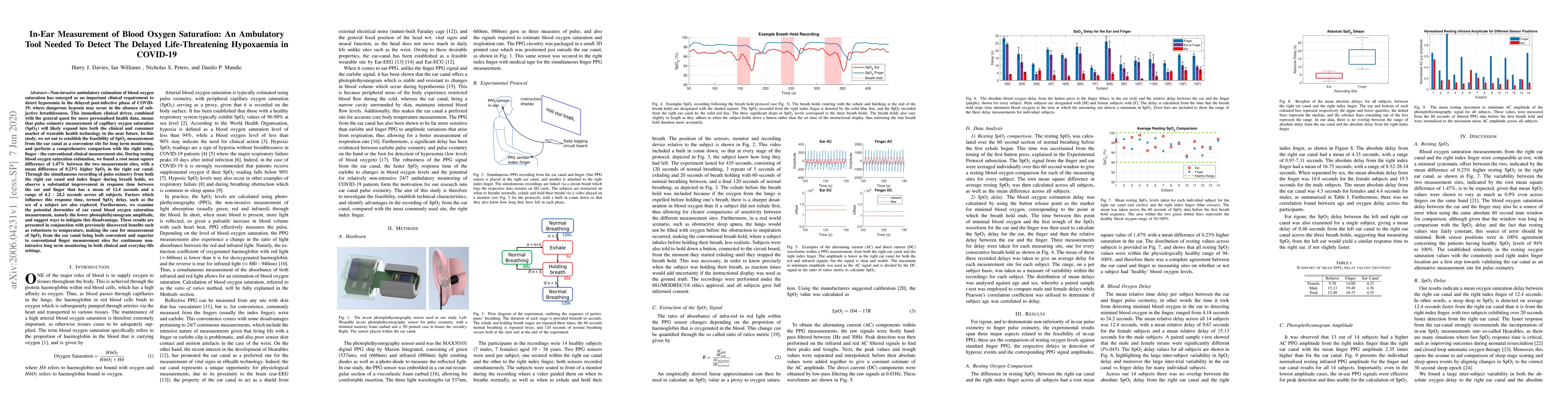 This study investigates the feasibility of using the ear canal for continuous, non-invasive blood oxygen saturation (SpO2) monitoring as an alternative to conventional finger measurement, finding a slight difference in SpO2 readings and a faster response time in the ear, with potential benefits for long-term, ambulatory monitoring in COVID-19 patients and beyond.