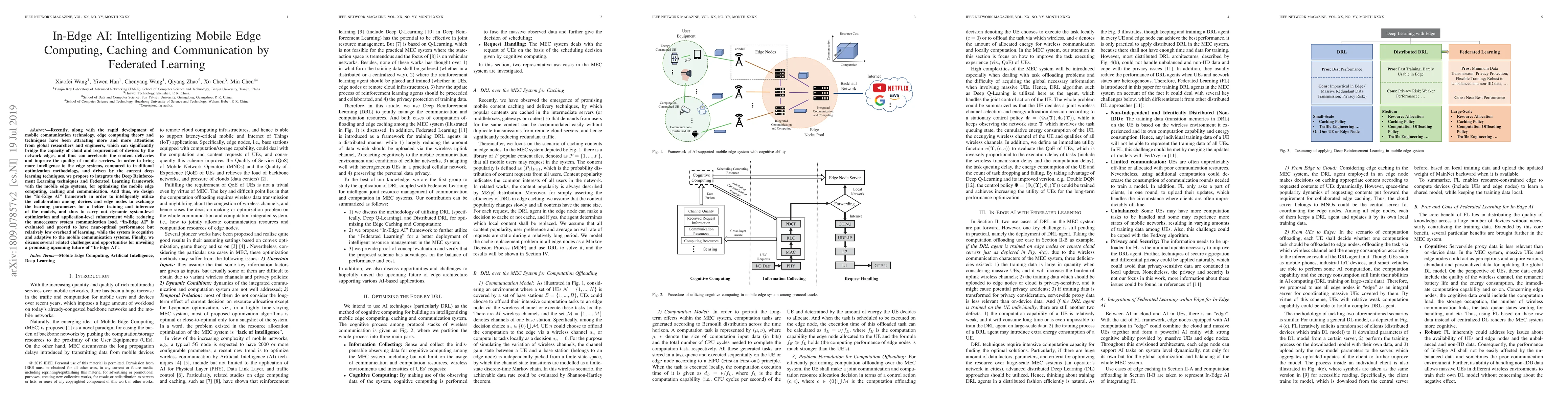 The paper proposes "In-Edge AI," a framework that integrates Deep Reinforcement Learning and Federated Learning to optimize mobile edge computing, caching, and communication. It demonstrates near-optimal performance with low learning overhead, enabling cognitive and adaptive enhancements to mobile communication systems.