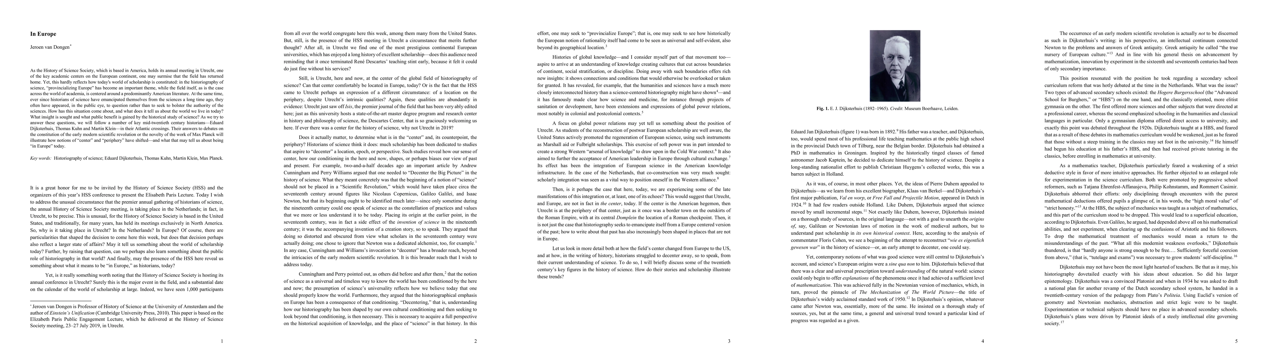 As the History of Science Society, which is based in America, holds its annual meeting in Utrecht, one of the key academic centers on the European continent, one may surmise that the field has returned home. Yet, this hardly reflects how today's world of scholarship is constituted: in the historiography of science, 'provincializing Europe' has become an important theme, while the field itself, as is the case across the world of academia, is centered around a predominantly American literature. At the same time, ever since historians of science have emancipated themselves from the sciences a long time ago, they often have appeared, in the public eye, to question rather than to seek to bolster the authority of the sciences. How has this situation come about, and what does it tell us about the world we live in today? What insight is sought and what public benefit is gained by the historical study of science? As we try to answer these questions, we will follow a number of key mid-twentieth century historians--Eduard Dijksterhuis, Thomas Kuhn and Martin Klein--in their Atlantic crossings. Their answers to debates on the constitution of the early modern scientific revolution or the novelty of the work of Max Planck will illustrate how notions of 'center' and 'periphery' have shifted--and what that may tell us about being 'in Europe' today.