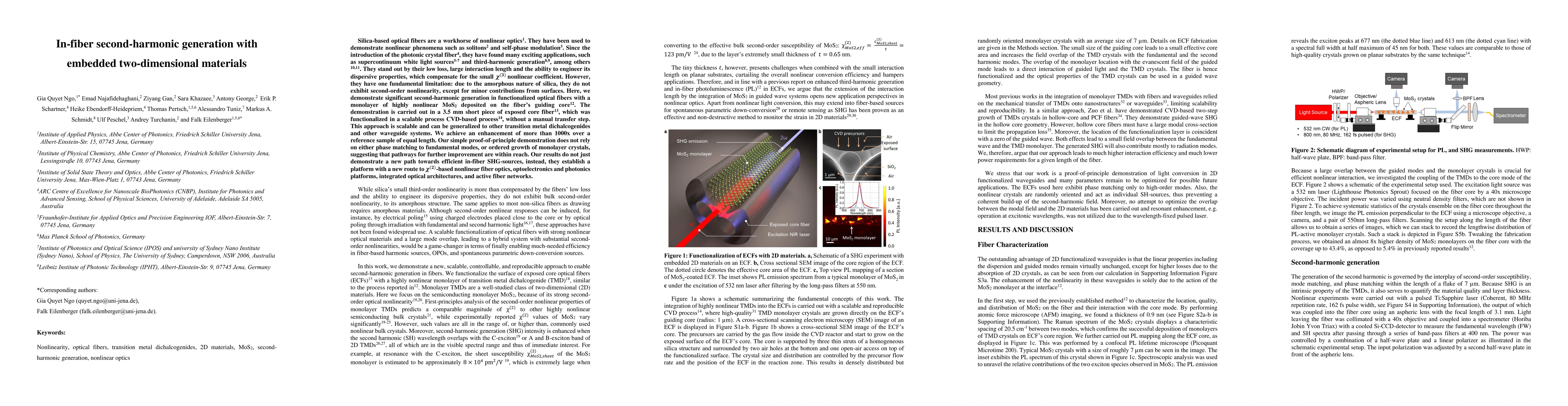 Researchers demonstrate significant second-harmonic generation in optical fibers with embedded monolayer MoS2, achieving over 1000x enhancement in a scalable process.