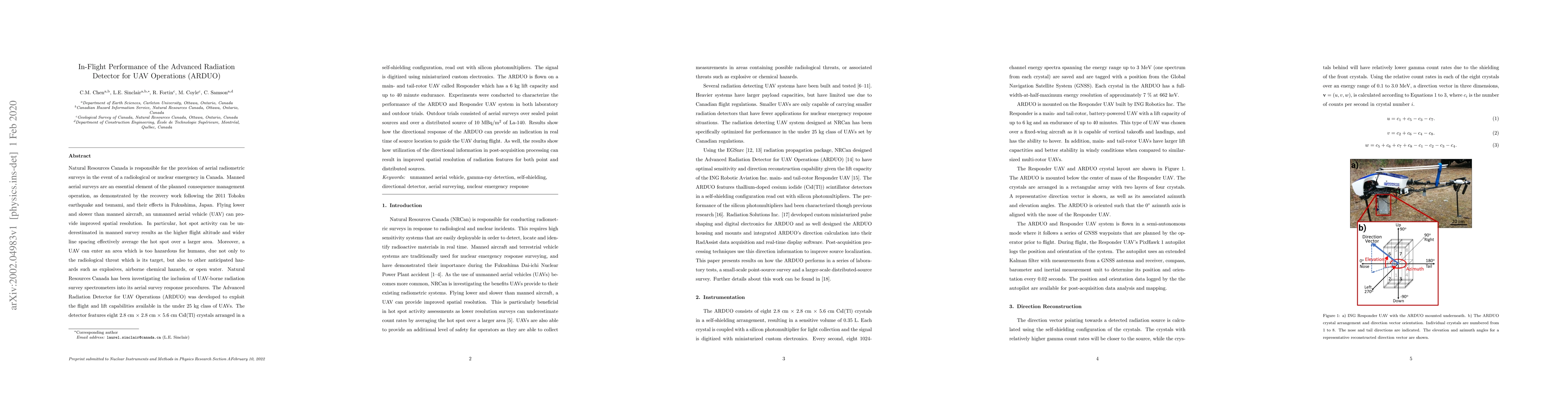 Natural Resources Canada (NRCan) is responsible for the provision of aerial radiometric surveys in the event of a radiological or nuclear emergency in Canada. Manned aerial surveys are an essential element of the planned consequence management operation, as demonstrated by the recovery work following the 2011 Tohoku earthquake and tsunami, and their effects in Fukushima, Japan. Flying lower and slower than manned aircraft, an unmanned aerial vehicle (UAV) can provide improved spatial resolution. In particular, hot spot activity can be underestimated in manned survey results as the higher flight altitude and wider line spacing effectively average the hot spot over a larger area. Moreover, a UAV can enter an area which is hazardous for humans. NRCan has been investigating the inclusion of UAV-borne radiation survey spectrometers into its aerial survey response procedures. The Advanced Radiation Detector for UAV Operations (ARDUO) was developed to exploit the flight and lift capabilities available in the under 25kg class of UAVs. The detector features eight 2.8cm x 2.8cm x 5.6cm CsI(Tl) crystals in a self-shielding configuration, read out with silicon photomultipliers and digitized using miniaturized custom electronics. The ARDUO is flown on a main- and tail-rotor UAV called Responder which has a 6kg lift capacity and up to 40min. endurance. The performance of the ARDUO-Responder UAV system was characterized in both lab and outdoor trials. Outdoor trials consisted of aerial surveys over sealed point sources and over a distributed source. Results show how the directional response of the ARDUO can provide an indication in real time of source location for in-flight guidance. As well, the results show how use of the directional information in post-acquisition processing can result in improved spatial resolution of radiation features for both point and distributed sources.