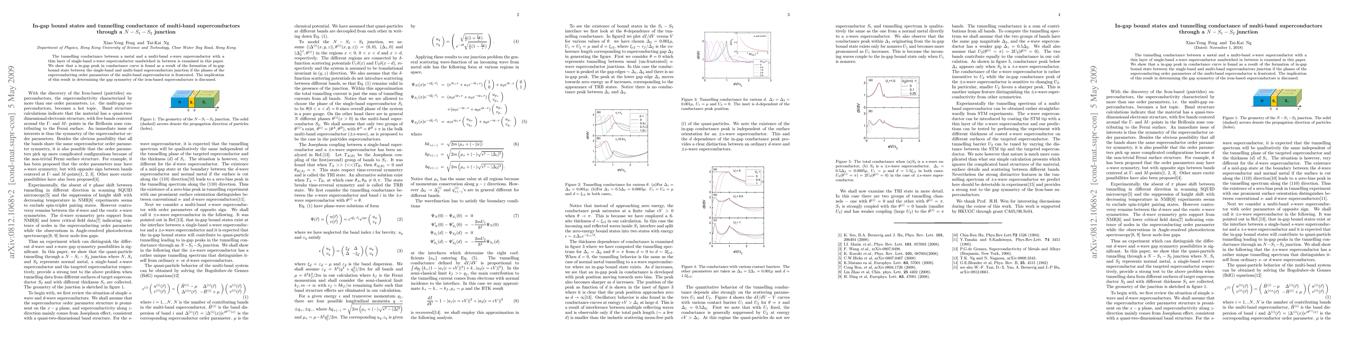 Researchers studied tunneling conductance between a metal and a multiband superconductor with a single-band s-wave superconductor in between. They found that frustrated phases of the superconducting order parameters create an in-gap peak in the conductance curve.
