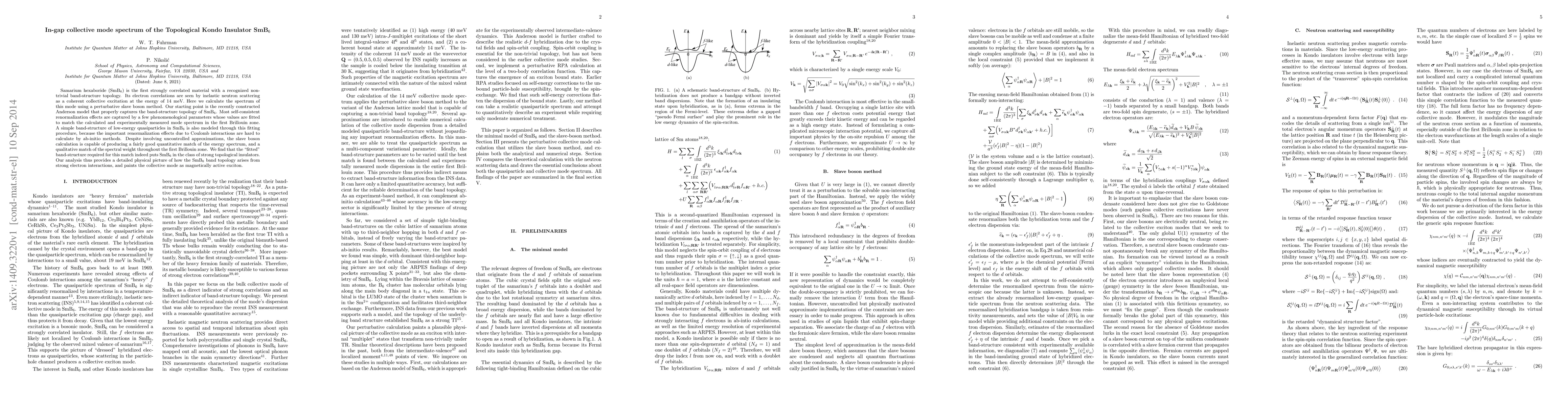 Samarium hexaboride (SmB$_6$) is the first strongly correlated material with a recognized non-trivial band-structure topology. Its electron correlations are seen by inelastic neutron scattering as a coherent collective excitation at the energy of 14 meV. Here we calculate the spectrum of this mode using a perturbative slave boson method. Our starting point is the recently constructed Anderson model that properly captures the band-structure topology of SmB$_6$. Most self-consistent renormalization effects are captured by a few phenomenological parameters whose values are fitted to match the calculated and experimentally measured mode spectrum in the first Brillouin zone. A simple band-structure of low-energy quasiparticles in SmB$_6$ is also modeled through this fitting procedure, because the important renormalization effects due to Coulomb interactions are hard to calculate by ab-initio methods. Despite involving uncontrolled approximations, the slave boson calculation is capable of producing a fairly good quantitative match of the energy spectrum, and a qualitative match of the spectral weight throughout the first Brillouin zone. We find that the "fitted" band-structure required for this match indeed puts SmB$_6$ in the class of strong topological insulators. Our analysis thus provides a detailed physical picture of how the SmB$_6$ band topology arises from strong electron interactions, and paints the collective mode as magnetically active exciton.